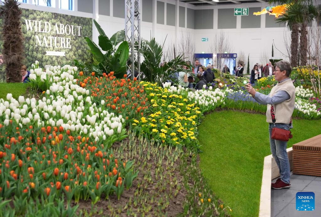 A visitor takes photos of flowers exhibited during the International Green Week (IGW) Berlin in Berlin, Germany, Jan. 20, 2023. The IGW Berlin, an international exhibition of the food, agriculture and gardening industries, opened on Friday and will last until Jan. 29, attracting around 1,400 exhibitors from all over the world. (Photo by Stefan Zeitz/Xinhua)