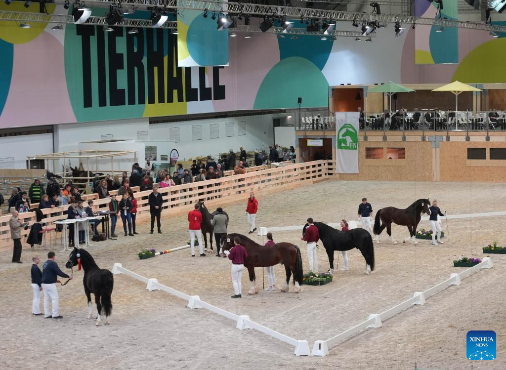People watch a demonstration of horses during the International Green Week (IGW) Berlin in Berlin, Germany, Jan. 20, 2023. The IGW Berlin, an international exhibition of the food, agriculture and gardening industries, opened on Friday and will last until Jan. 29, attracting around 1,400 exhibitors from all over the world. (Photo by Stefan Zeitz/Xinhua)