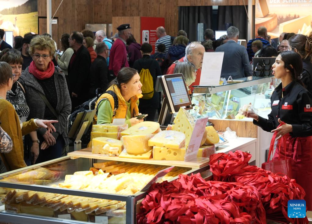 Visitors buy cheese during the International Green Week (IGW) Berlin in Berlin, Germany, Jan. 20, 2023. The IGW Berlin, an international exhibition of the food, agriculture and gardening industries, opened on Friday and will last until Jan. 29, attracting around 1,400 exhibitors from all over the world. (Photo by Stefan Zeitz/Xinhua)