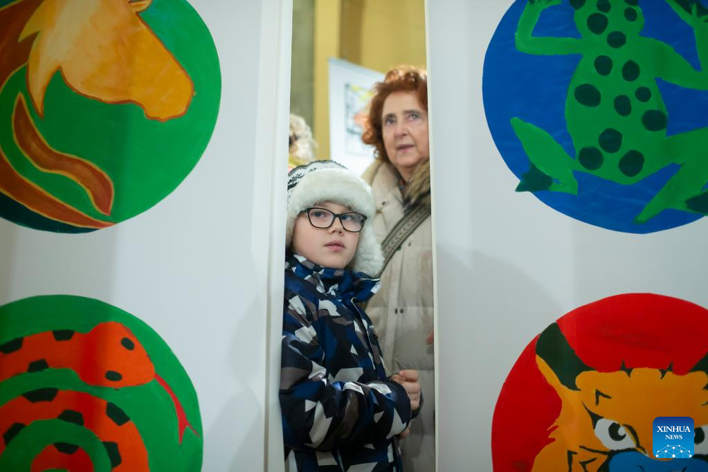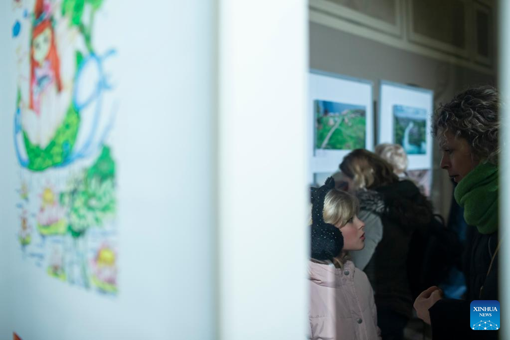 People visit an art exhibition at Ljubljana City Hall in Ljubljana, Slovenia, on Jan. 24, 2023. Over 100 artworks by Slovenian children on the theme of China are on display at an exhibition that opened at Ljubljana City Hall Tuesday. (Photo by Zeljko Stevanic/Xinhua)