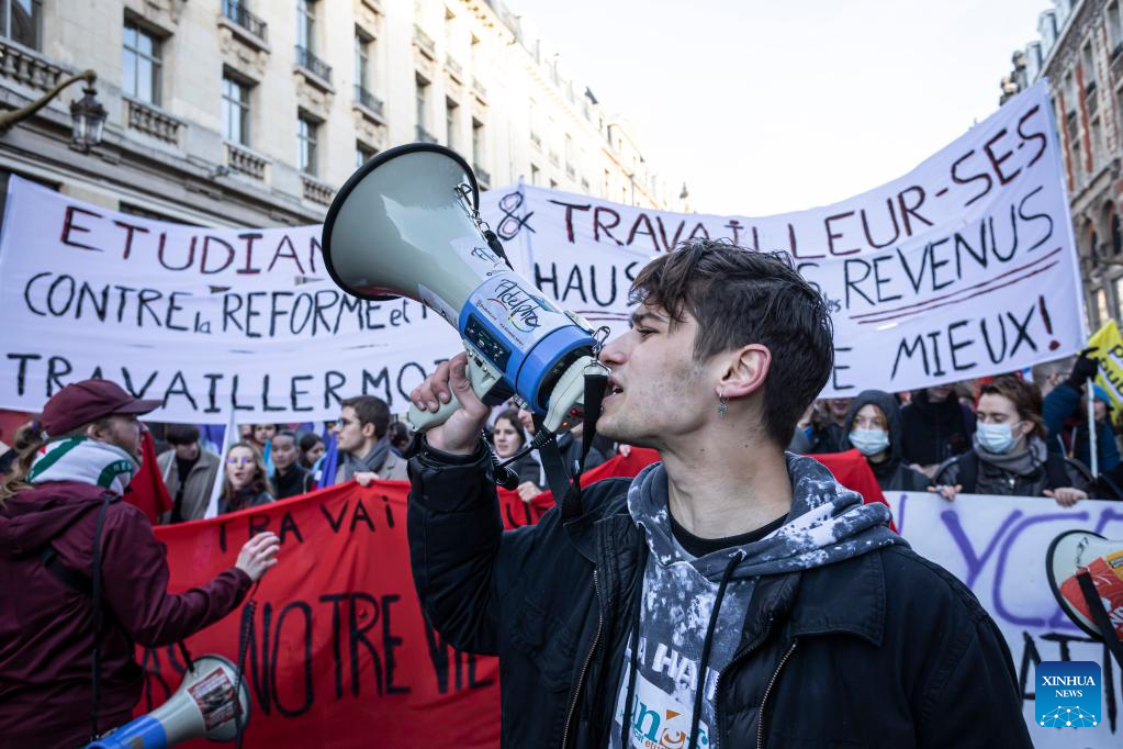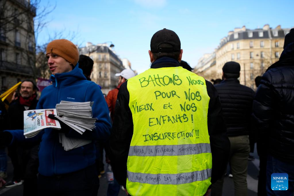 People participate in a protest against the government's controversial pension reform plan in Paris, France, on Jan. 31, 2023. People across France took to the streets again on Tuesday to protest against the government's controversial pension reform plan. The first nationwide strike was held on Jan. 19. (Photo by Glenn Gervot/Xinhua)