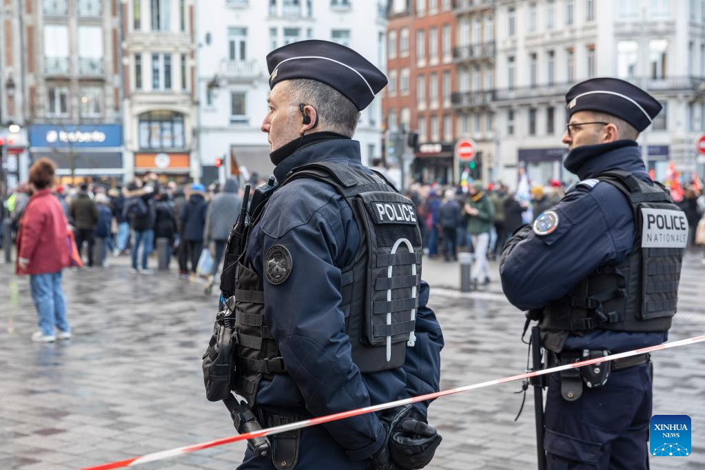Policemen stand guard during a demonstration against the government's controversial pension reform plan in Lille, northern France, on Jan. 31, 2023. People across France took to the streets again on Tuesday to protest against the government's controversial pension reform plan. The first nationwide strike was held on Jan. 19. (Photo by Sebastien Courdji/Xinhua)