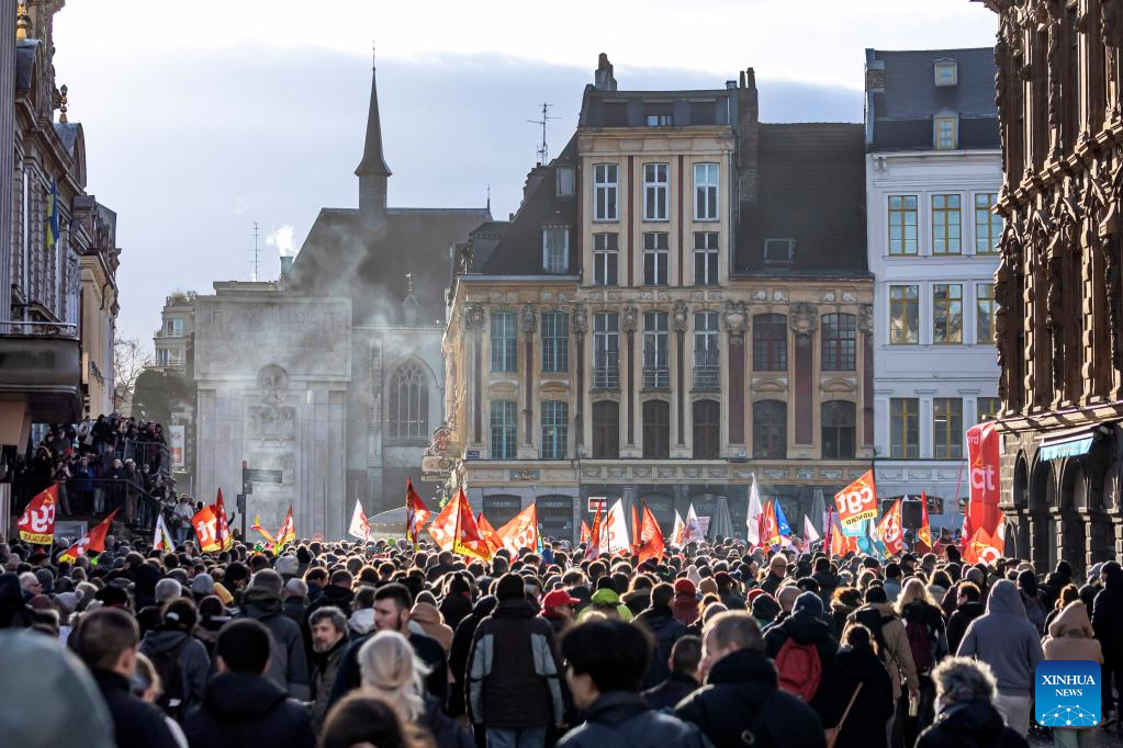 People participate in a demonstration against the government's controversial pension reform plan in Lille, northern France, on Jan. 31, 2023. People across France took to the streets again on Tuesday to protest against the government's controversial pension reform plan. The first nationwide strike was held on Jan. 19. (Photo by Sebastien Courdji/Xinhua)