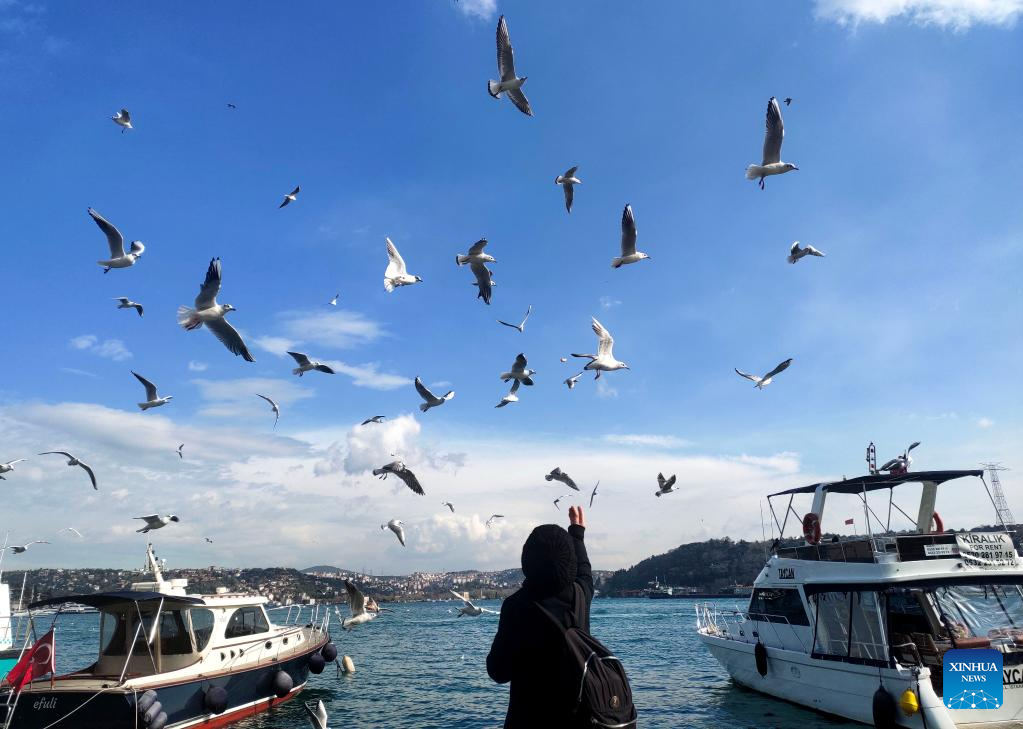 A tourist feeds seagulls at the Bosporus Strait in Istanbul, Türkiye, Feb. 2, 2023. (Xinhua/Shadati)