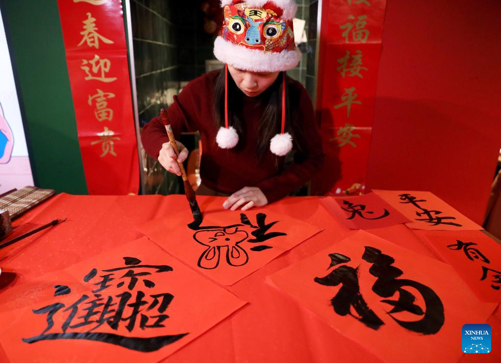 A woman writes Chinese calligraphy during "Exploring Yummy Chongqing in London" event in London, Britain, Feb. 2, 2023. Hot and spicy food from China has been warming up Londoners on another overcast winter day, as "Exploring Yummy Chongqing in London", part of the 2023 UK "Happy Chinese New Year" celebrations, officially kicked off here on Thursday. (Xinhua/Li Ying)