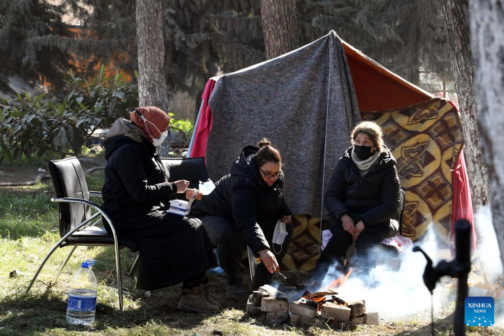 People rest by their temporary shelter in Antakya in the southern province of Hatay, Türkiye, Feb. 14, 2023. The death toll from last week's powerful earthquakes in southern Türkiye rose to 35,418 on Tuesday. A total of 105,505 people were injured in the tremors, of whom 13,208 are still receiving treatment in hospitals, Turkish President Recep Tayyip Erdogan said at a press conference after a cabinet meeting. (Xinhua/Shadati)