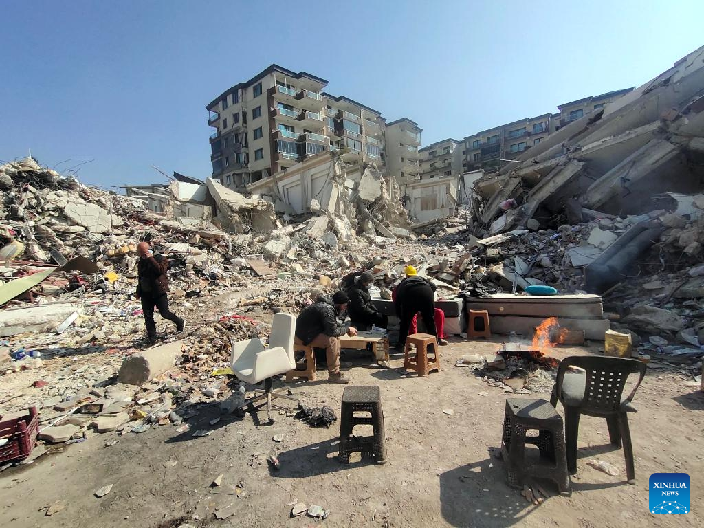 People rest by earthquake debris in Antakya in the southern province of Hatay, Türkiye, Feb. 13, 2023. The death toll from last week's powerful earthquakes in southern Türkiye rose to 35,418 on Tuesday. A total of 105,505 people were injured in the tremors, of whom 13,208 are still receiving treatment in hospitals, Turkish President Recep Tayyip Erdogan said at a press conference after a cabinet meeting. (Xinhua/Shadati)