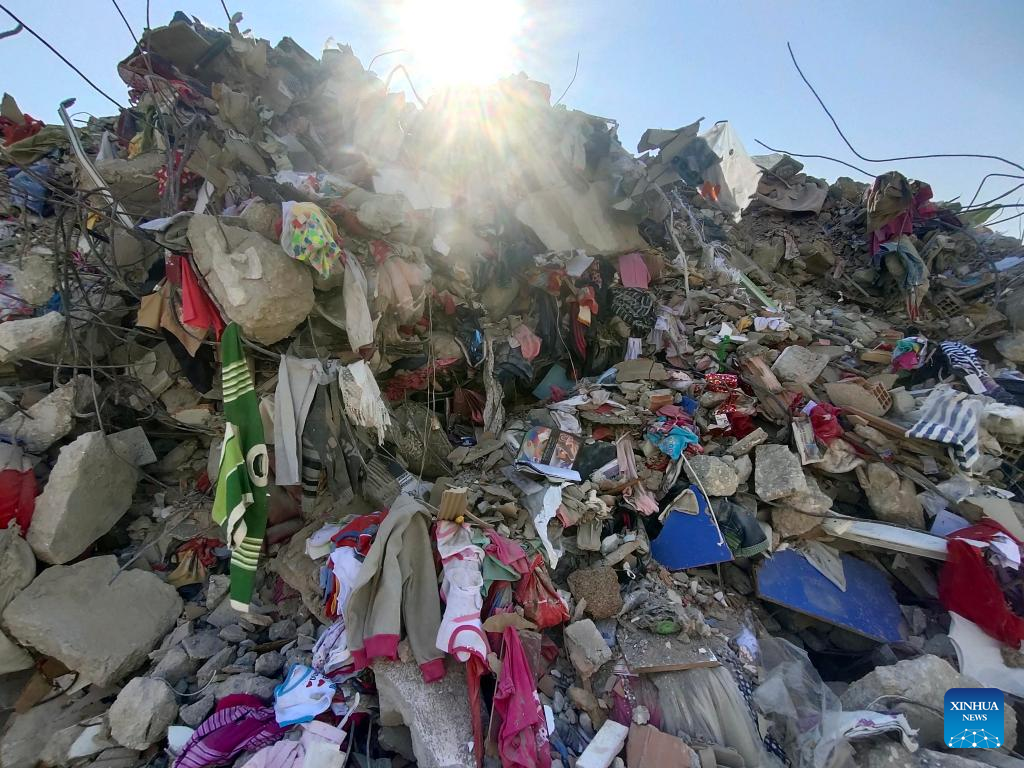 This photo taken on Feb. 14, 2023 shows earthquake debris in Antakya of Hatay Province, Türkiye. The death toll from last week's powerful earthquakes in southern Türkiye rose to 35,418 on Tuesday. A total of 105,505 people were injured in the tremors, of whom 13,208 are still receiving treatment in hospitals, Turkish President Recep Tayyip Erdogan said at a press conference after a cabinet meeting. (Xinhua/Shadati)