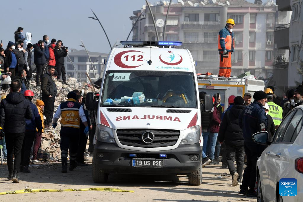 An ambulance is seen near earthquake debris in Antakya in the southern province of Hatay, Türkiye, Feb. 13, 2023. The death toll from last week's powerful earthquakes in southern Türkiye rose to 35,418 on Tuesday. A total of 105,505 people were injured in the tremors, of whom 13,208 are still receiving treatment in hospitals, Turkish President Recep Tayyip Erdogan said at a press conference after a cabinet meeting. (Xinhua/Shadati)