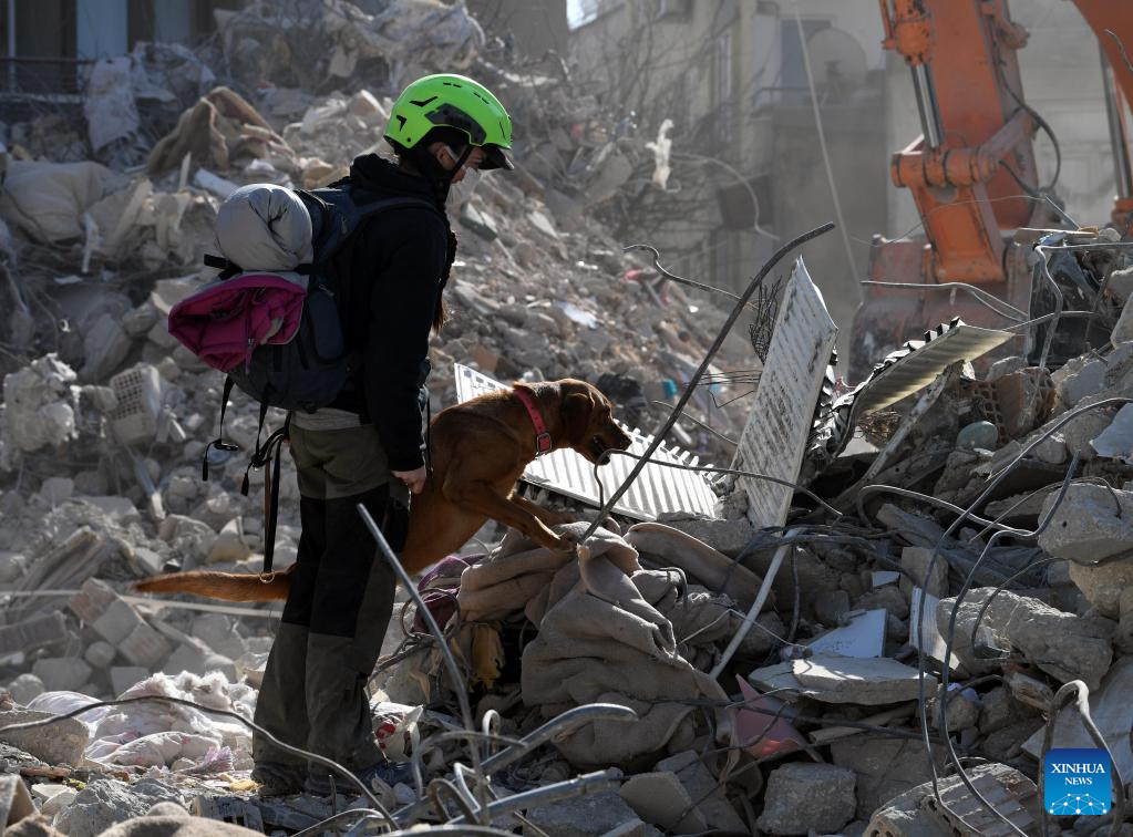 A woman and her dog search on earthquake debris in Antakya in the southern province of Hatay, Türkiye, Feb. 14, 2023. The death toll from last week's powerful earthquakes in southern Türkiye rose to 35,418 on Tuesday. A total of 105,505 people were injured in the tremors, of whom 13,208 are still receiving treatment in hospitals, Turkish President Recep Tayyip Erdogan said at a press conference after a cabinet meeting. (Xinhua/Shadati)