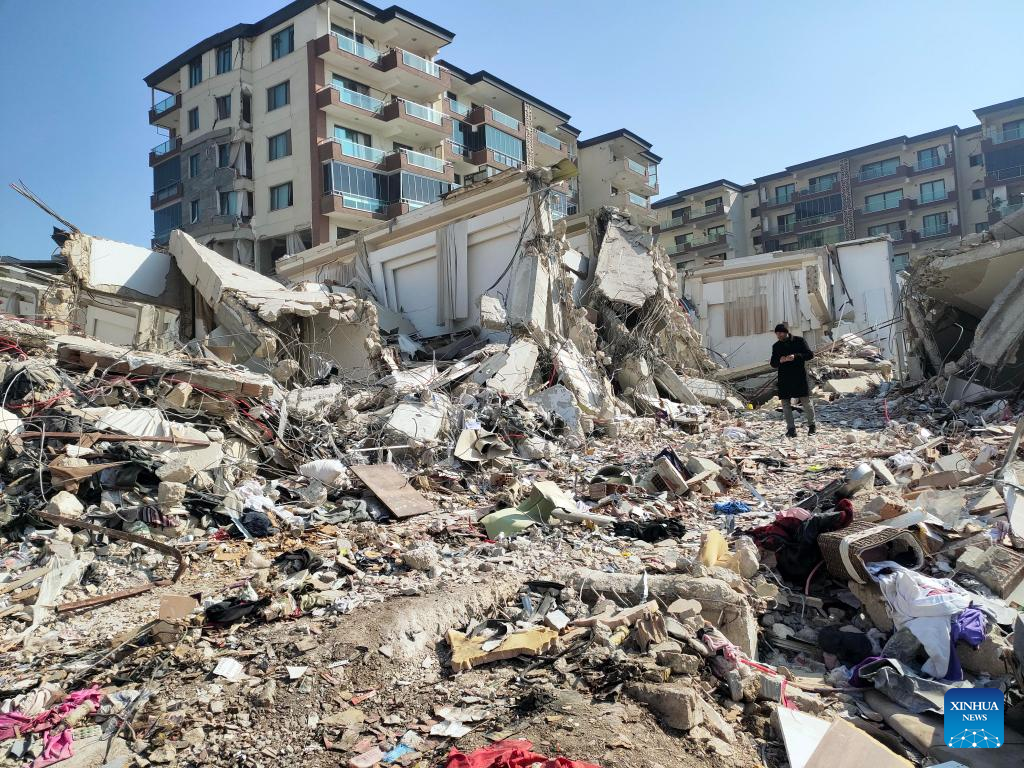 A man walks through earthquake debris in Antakya in the southern province of Hatay, Türkiye, Feb. 13, 2023. The death toll from last week's powerful earthquakes in southern Türkiye rose to 35,418 on Tuesday. A total of 105,505 people were injured in the tremors, of whom 13,208 are still receiving treatment in hospitals, Turkish President Recep Tayyip Erdogan said at a press conference after a cabinet meeting. (Xinhua/Shadati)