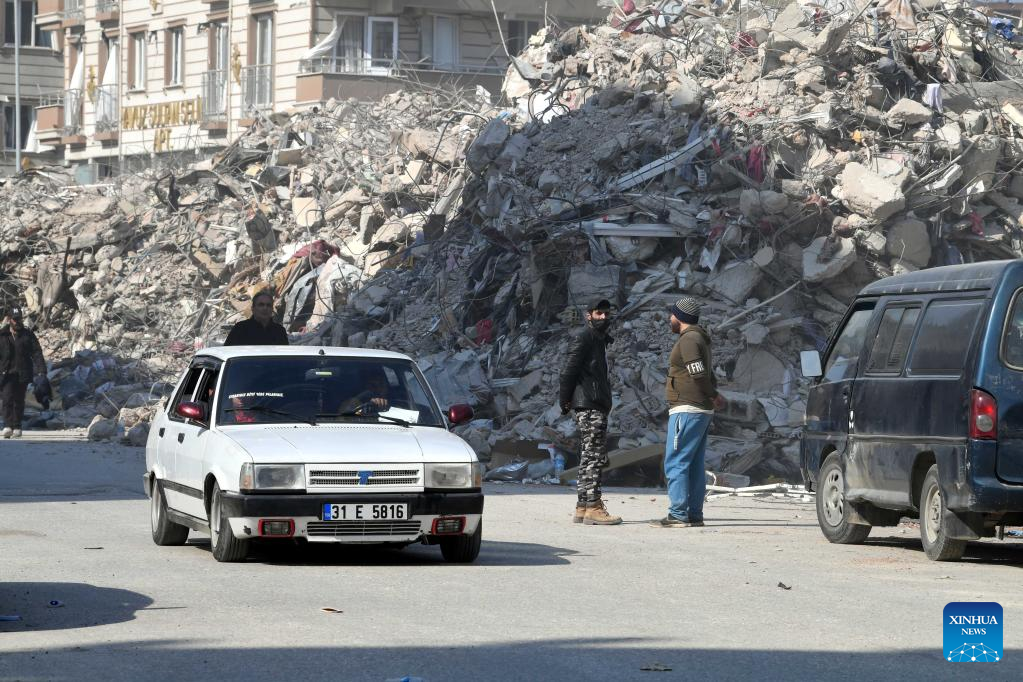 People stand by earthquake debris in Antakya in the southern province of Hatay, Türkiye, Feb. 13, 2023. The death toll from last week's powerful earthquakes in southern Türkiye rose to 35,418 on Tuesday. A total of 105,505 people were injured in the tremors, of whom 13,208 are still receiving treatment in hospitals, Turkish President Recep Tayyip Erdogan said at a press conference after a cabinet meeting. (Xinhua/Shadati)