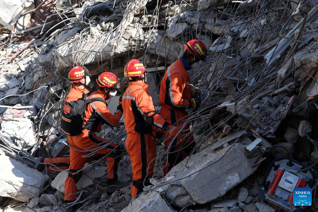 Members of the China Search and Rescue Team carry out rescue operation on earthquake debris in Antakya in the southern province of Hatay, Türkiye, Feb. 14, 2023. The death toll from last week's powerful earthquakes in southern Türkiye rose to 35,418 on Tuesday. A total of 105,505 people were injured in the tremors, of whom 13,208 are still receiving treatment in hospitals, Turkish President Recep Tayyip Erdogan said at a press conference after a cabinet meeting. (Xinhua/Shadati)