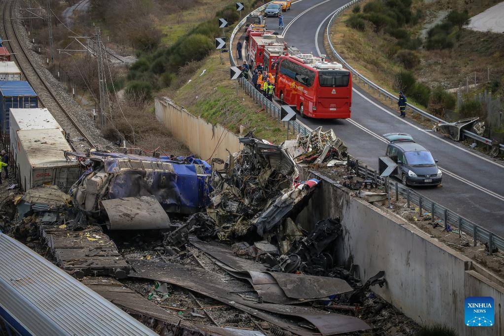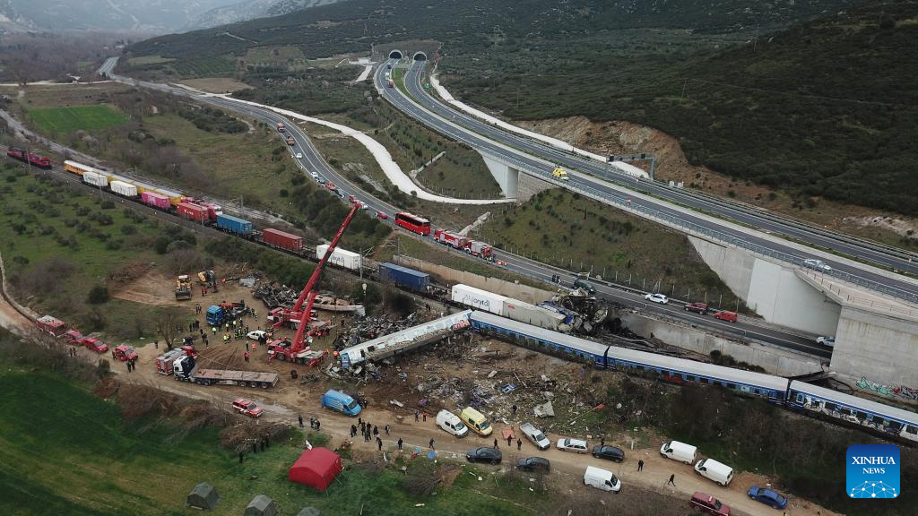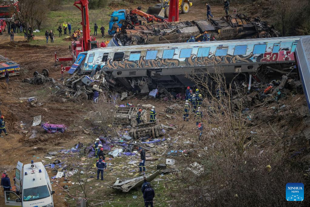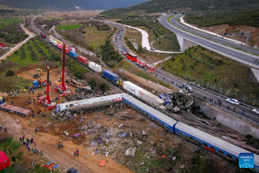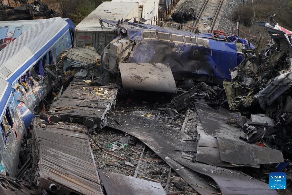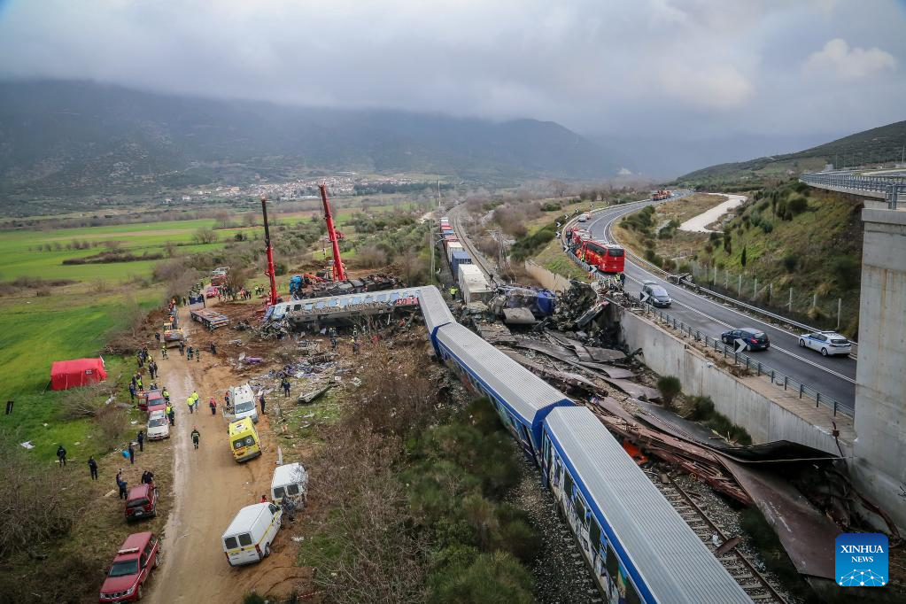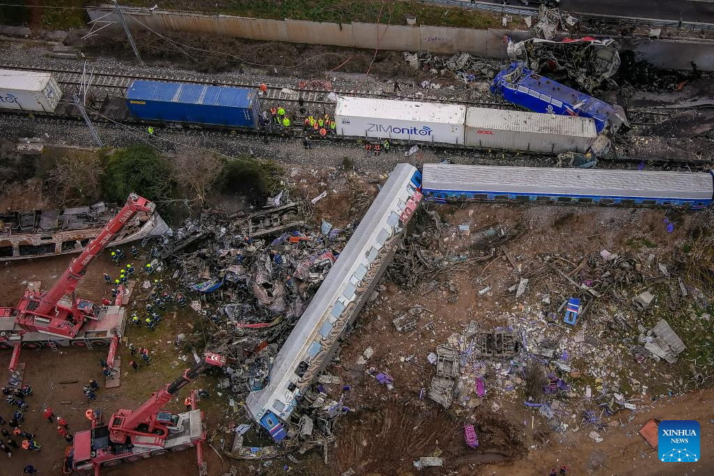 This aerial photo taken on March 1, 2023 shows the scene of a collision of two trains at Tempi municipality, Greece. The death toll from the collision of two trains in central Greece on late Tuesday night has increased to 36, while 66 injured people were still hospitalized, including six in serious condition in intensive care units, the Greek Fire Service said on Wednesday. (Photo by Angelos Tsatsis/Xinhua)