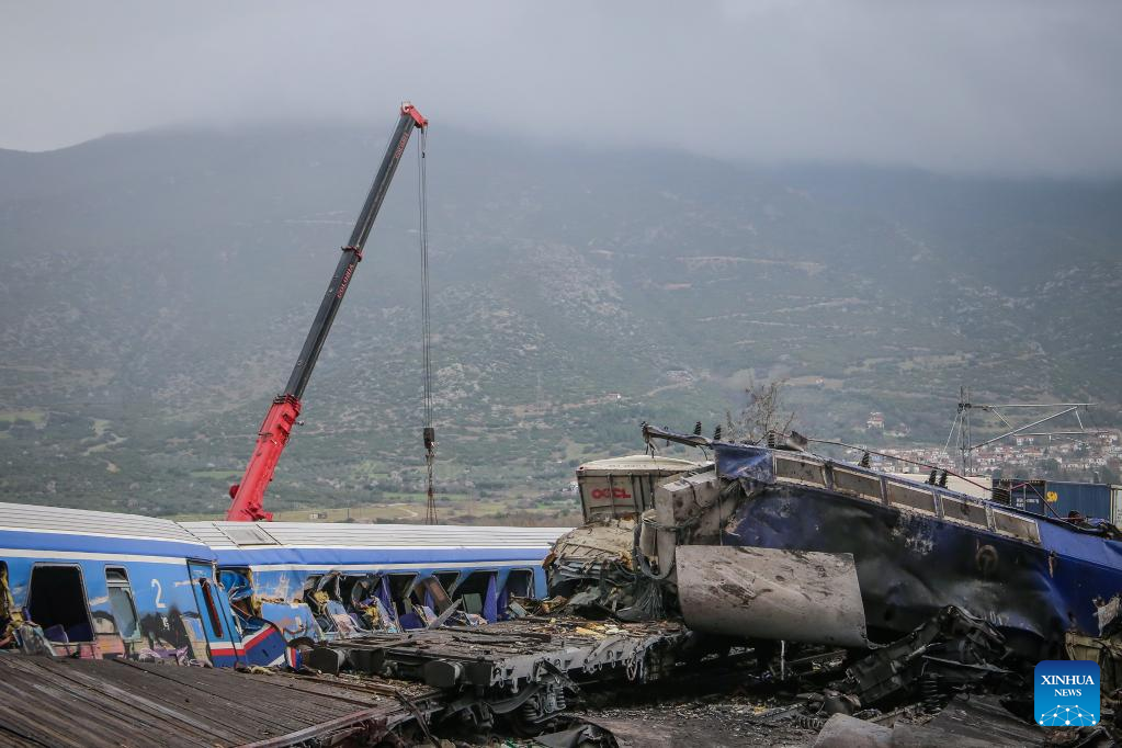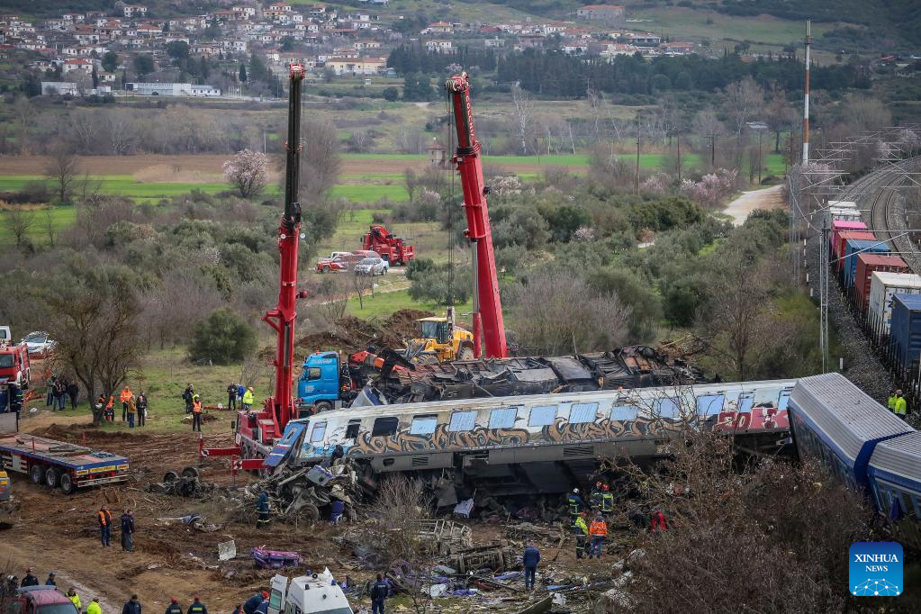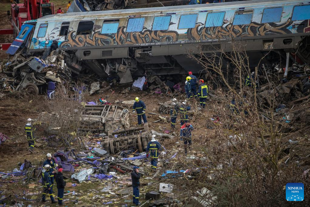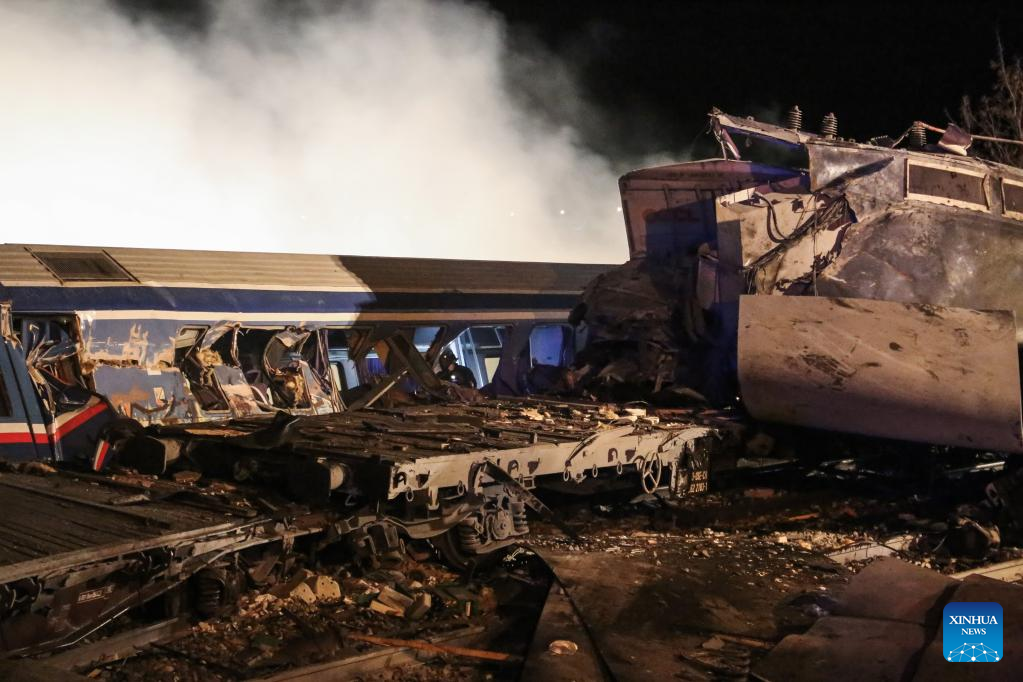 This photo taken on March 1, 2023 shows the site of a collision of two trains at Tempi municipality, Greece. The death toll from the collision of two trains in central Greece on late Tuesday night has increased to 36, while 66 injured people were still hospitalized, including six in serious condition in intensive care units, the Greek Fire Service said on Wednesday. (Photo by Angelos Tsatsis/Xinhua)