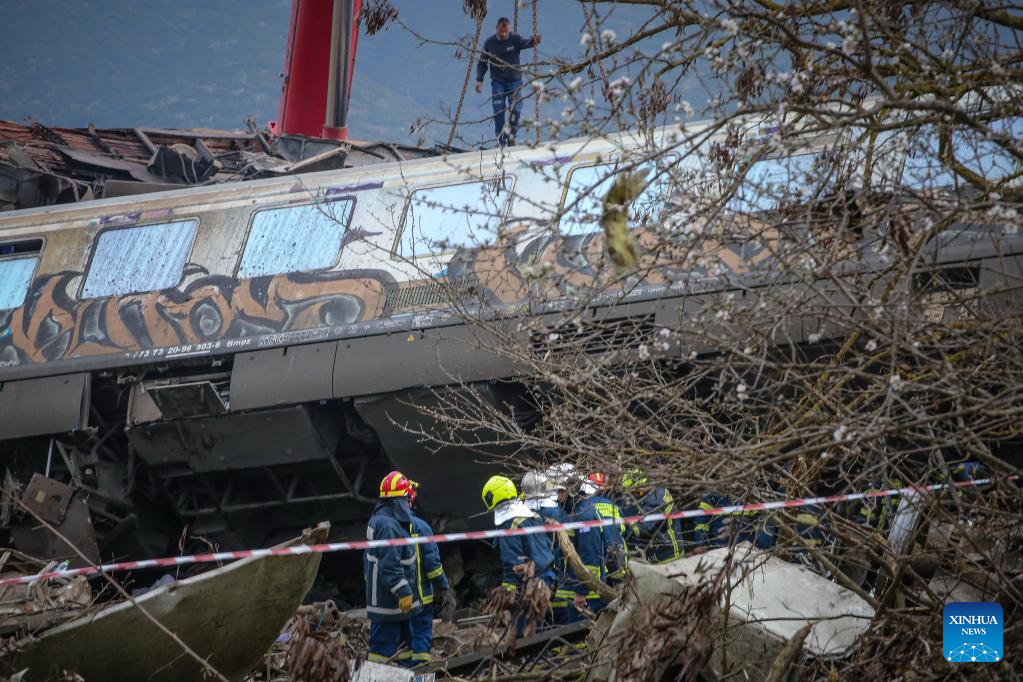 Firefighters carry out search and rescue operation at the site of a collision of two trains at Tempi municipality, Greece, March 1, 2023. The death toll from the collision of two trains in central Greece on late Tuesday night has increased to 36, while 66 injured people were still hospitalized, including six in serious condition in intensive care units, the Greek Fire Service said on Wednesday. (Photo by Angelos Tsatsis/Xinhua)