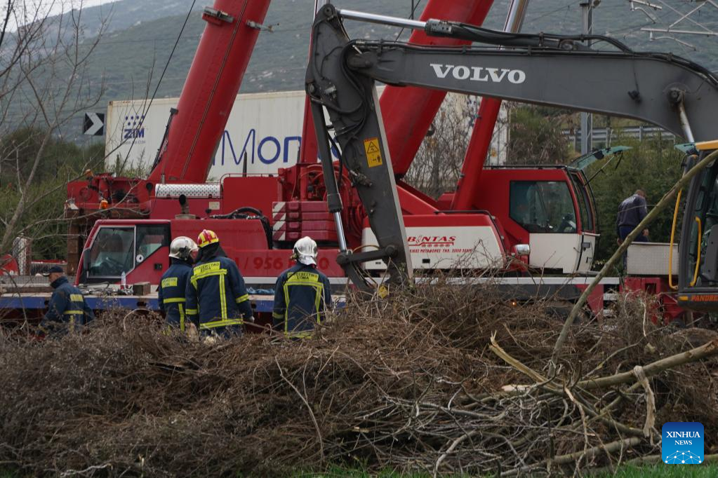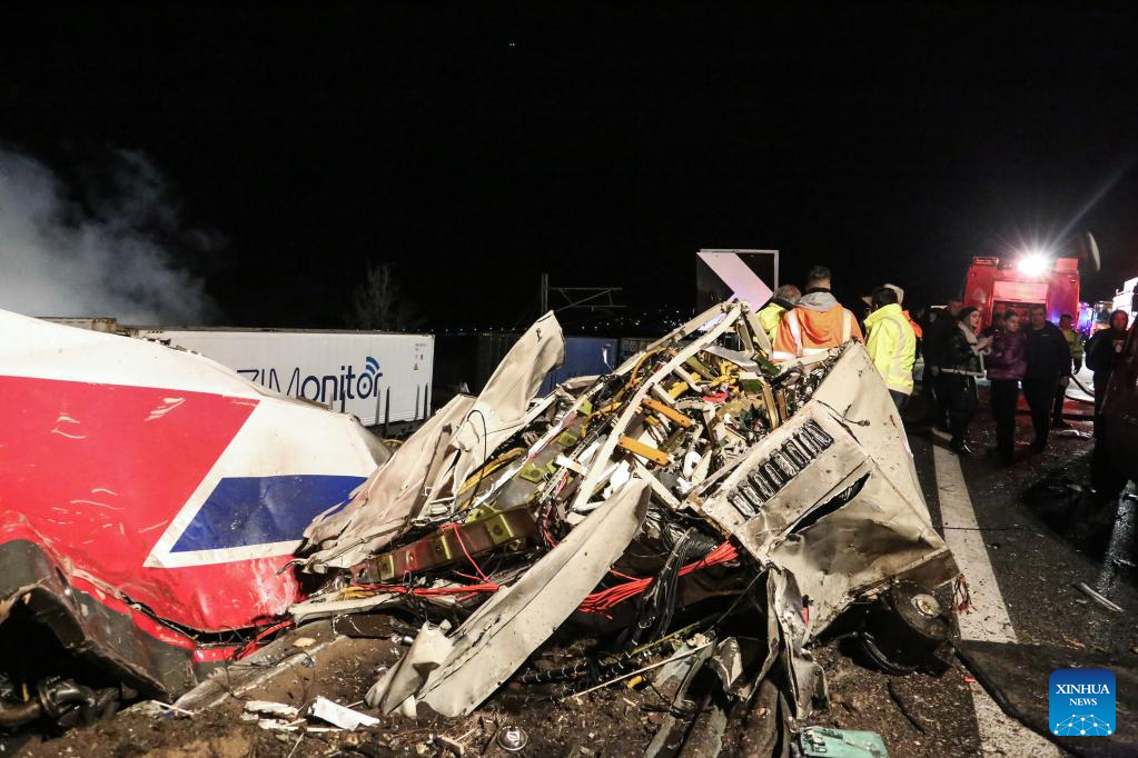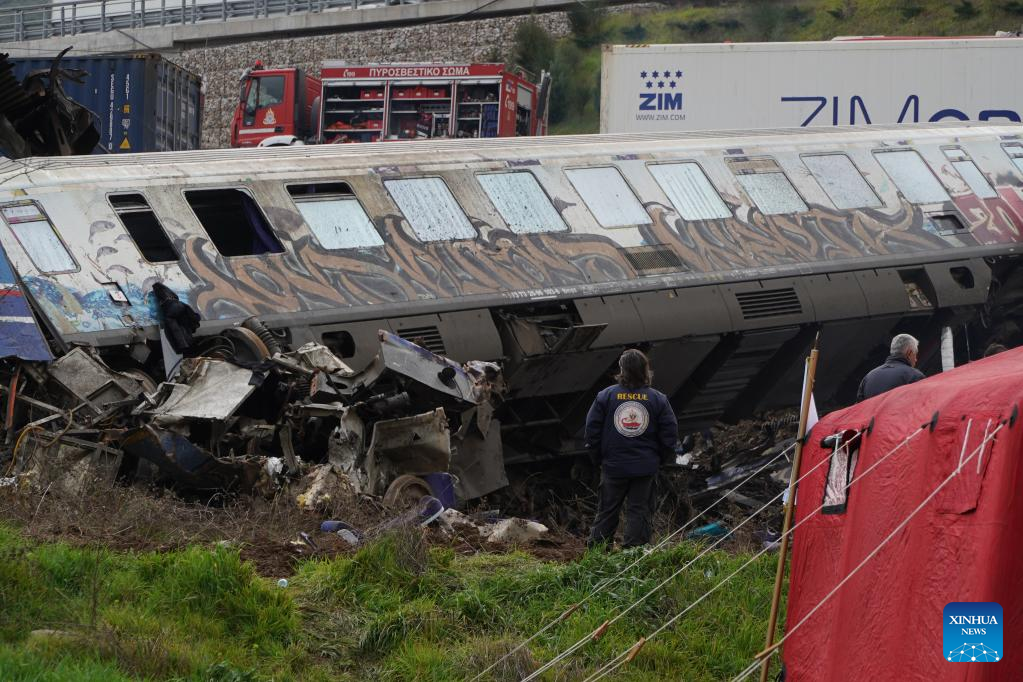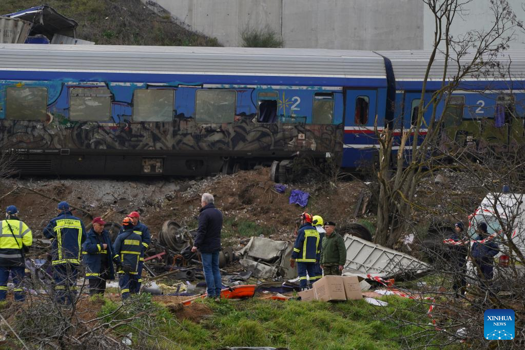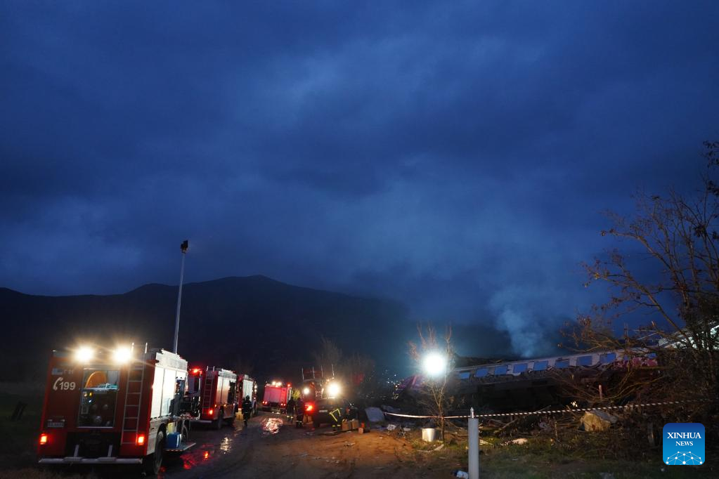 This photo taken on March 1, 2023 shows the site of a collision of two trains at Tempi municipality, Greece. The death toll from the collision of two trains in central Greece on late Tuesday night has increased to 36, while 66 injured people were still hospitalized, including six in serious condition in intensive care units, the Greek Fire Service said on Wednesday. (Photo by Leonidas Tzekas/Xinhua)