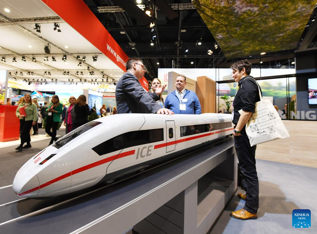 People communicate at the booth of Deutsche Bahn (DB) during the ITB Berlin travel trade show in Berlin, Germany, March 7, 2023. The ITB Berlin travel trade show kicked off here on Tuesday and will last until March 9. (Xinhua/Ren Pengfei)