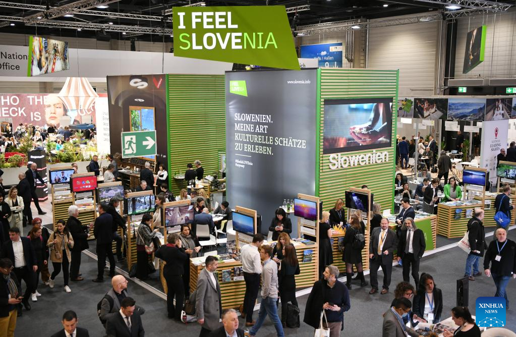 This photo taken on March 7, 2023 shows the booth of Slovenia during the ITB Berlin travel trade show in Berlin, Germany. The ITB Berlin travel trade show kicked off here on Tuesday and will last until March 9. (Xinhua/Ren Pengfei)