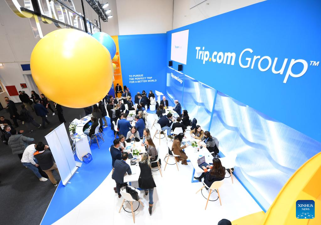 This photo taken on March 7, 2023 shows the booth of Trip.com Group during the ITB Berlin travel trade show in Berlin, Germany. The ITB Berlin travel trade show kicked off here on Tuesday and will last until March 9. (Xinhua/Ren Pengfei)