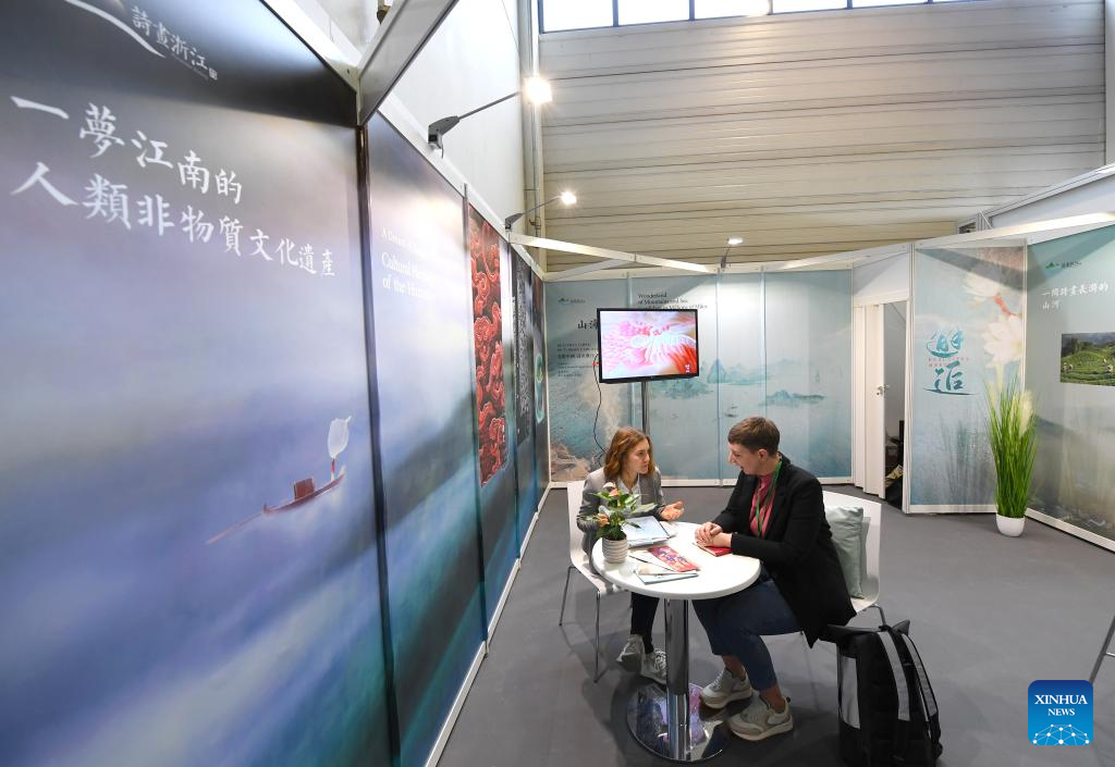 A visitor (R) talks with a staff member at the booth of Zhejiang, China, during the ITB Berlin travel trade show in Berlin, Germany, on March 7, 2023. The ITB Berlin travel trade show kicked off here on Tuesday and will last until March 9. (Xinhua/Ren Pengfei)