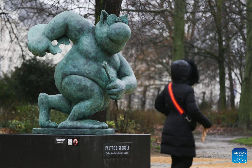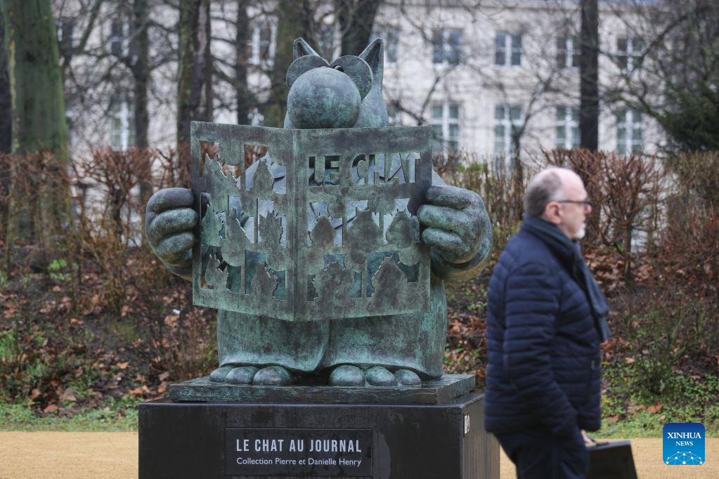 A sculpture of Le Chat is seen at the Brussels Park in Brussels, Belgium, March 10, 2023. A total of 22 sculptures of Le Chat, a comic strip icon created by Belgian cartoonist Philippe Geluck, are on exhibition at Brussels Park. The exhibition will last until June 30. (Xinhua/Zheng Huansong)