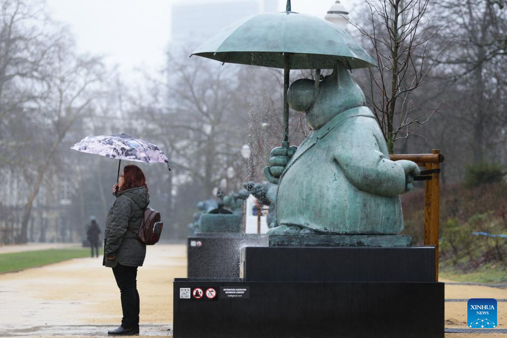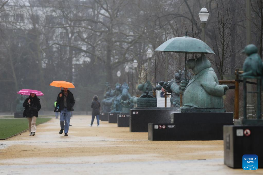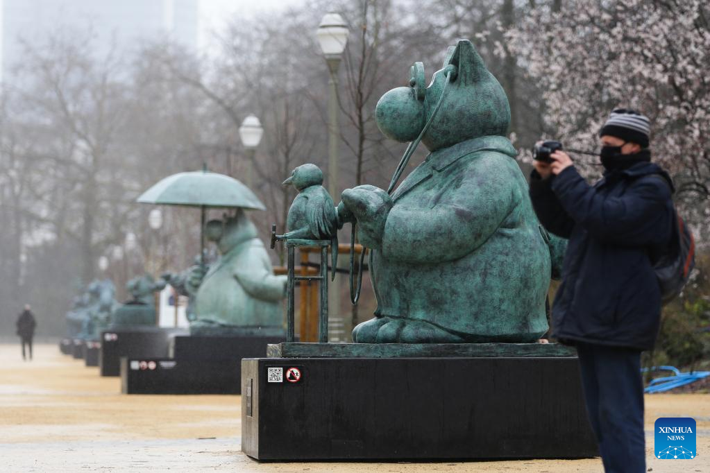 People pass by sculptures of Le Chat at the Brussels Park in Brussels, Belgium, March 10, 2023. A total of 22 sculptures of Le Chat, a comic strip icon created by Belgian cartoonist Philippe Geluck, are on exhibition at Brussels Park. The exhibition will last until June 30. (Xinhua/Zheng Huansong)