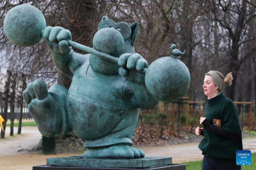 A man passes by a sculpture of Le Chat at the Brussels Park in Brussels, Belgium, March 10, 2023. A total of 22 sculptures of Le Chat, a comic strip icon created by Belgian cartoonist Philippe Geluck, are on exhibition at Brussels Park. The exhibition will last until June 30. (Xinhua/Zheng Huansong)