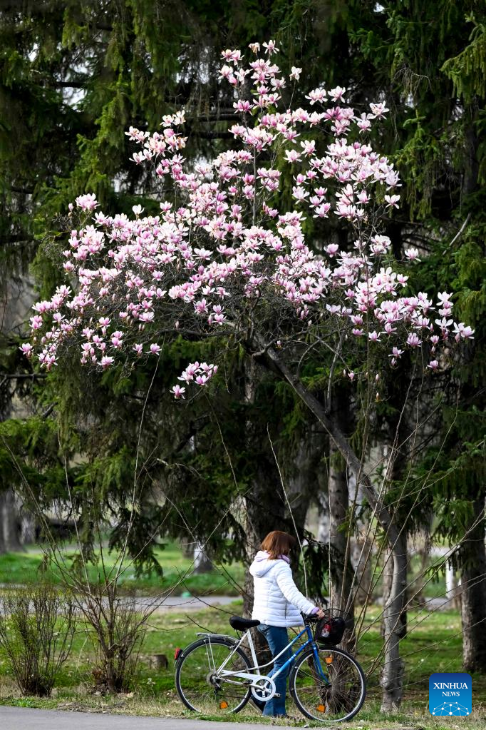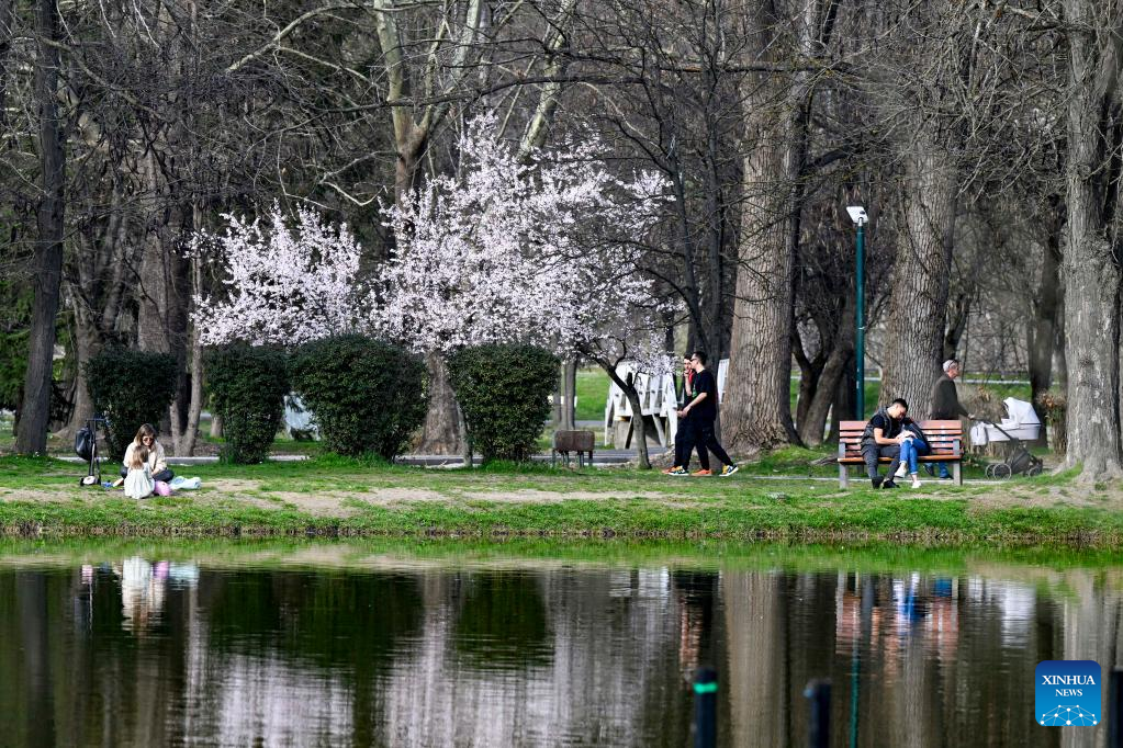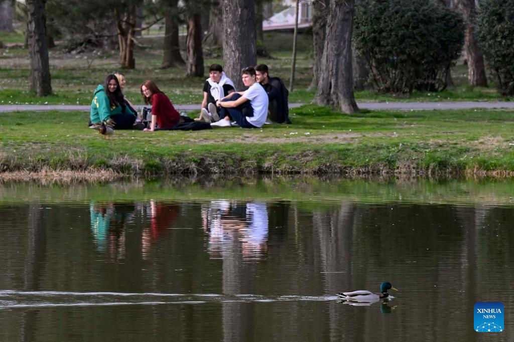 People enjoy the scenery at a park in Skopje, North Macedonia, March 20, 2023. (Photo by Tomislav Georgiev/Xinhua)