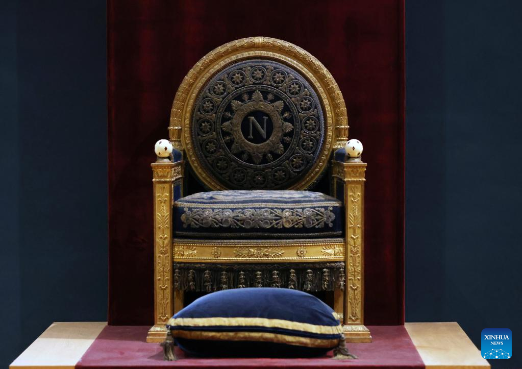 This photo taken on March 22, 2023 shows the throne of Napoleon I displayed at the Louvre Museum in Paris, France. The Louvre, formerly a royal residence, became a museum in 1793 during the French Revolution. (Xinhua/Gao Jing)