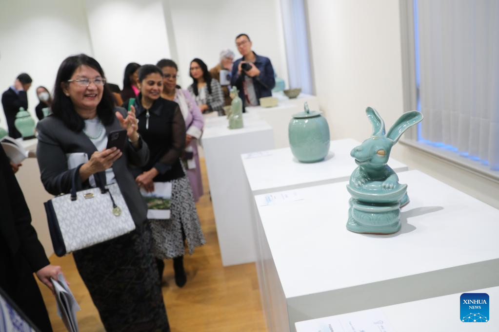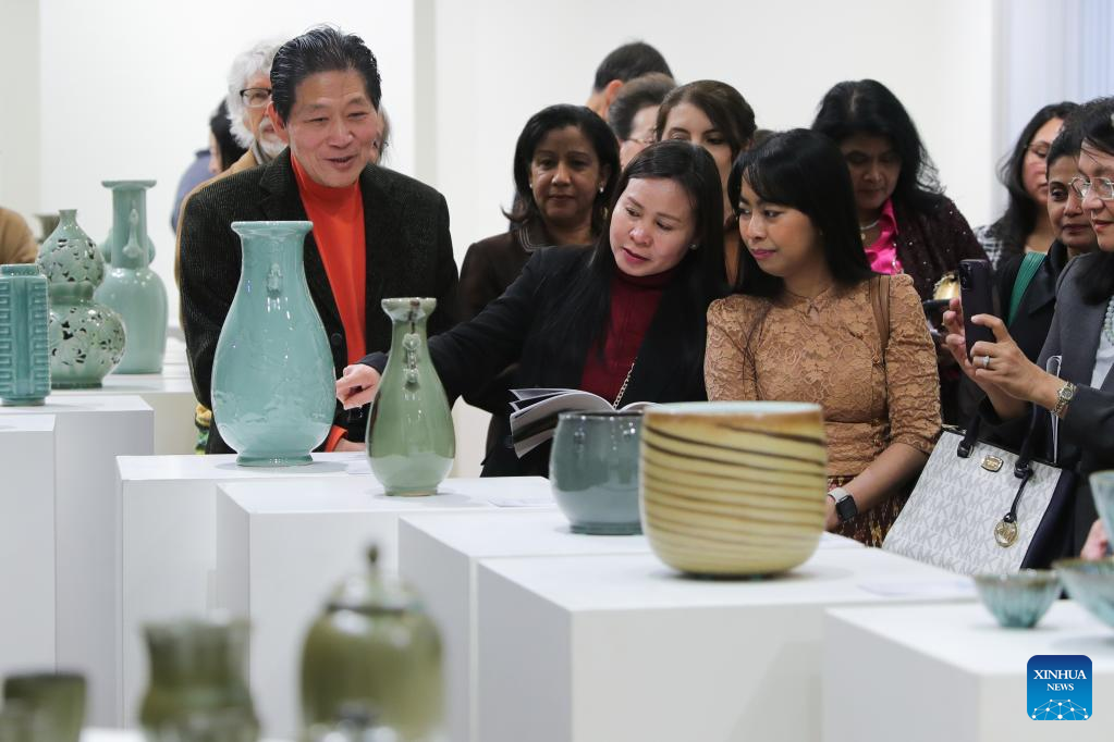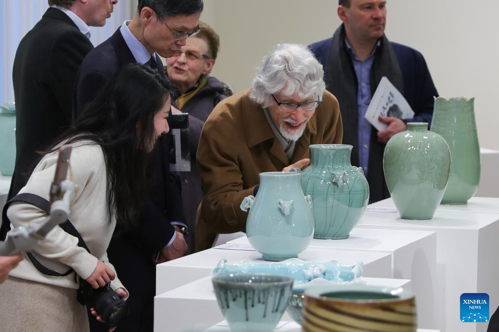 Visitors look at exhibits during the "Longquan City Celadon Art" exhibition at the Chinese Cultural Center in Brussels, Belgium, on April 3, 2023. The opening ceremony of the "Longquan City Celadon Art" exhibition was held Monday at the Chinese Cultural Center, with 55 works made by Chinese artists on display. (Xinhua/Zheng Huansong)