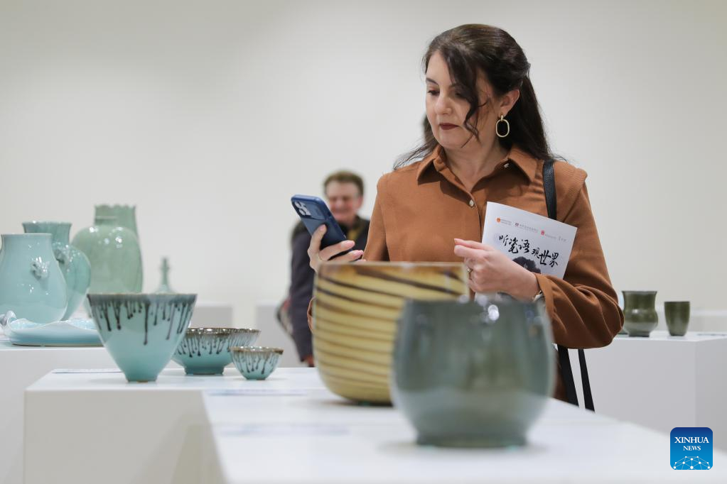 A visitor takes photos of an exhibit during the "Longquan City Celadon Art" exhibition at the Chinese Cultural Center in Brussels, Belgium, on April 3, 2023. The opening ceremony of the "Longquan City Celadon Art" exhibition was held Monday at the Chinese Cultural Center, with 55 works made by Chinese artists on display. (Xinhua/Zheng Huansong)