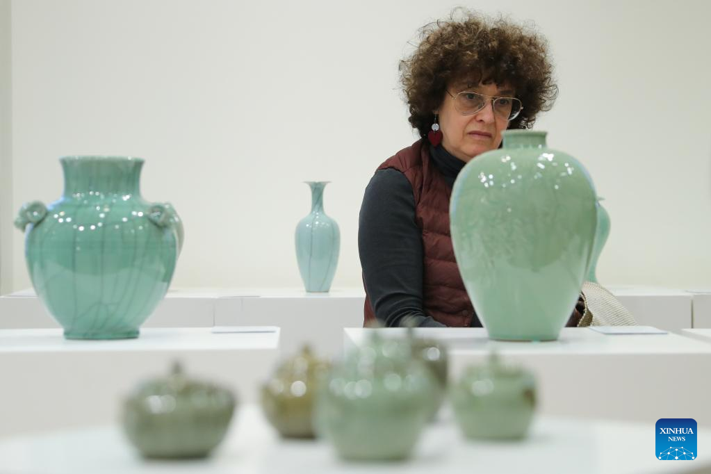 A visitor looks at an exhibit during the "Longquan City Celadon Art" exhibition at the Chinese Cultural Center in Brussels, Belgium, on April 3, 2023. The opening ceremony of the "Longquan City Celadon Art" exhibition was held Monday at the Chinese Cultural Center, with 55 works made by Chinese artists on display. (Xinhua/Zheng Huansong)