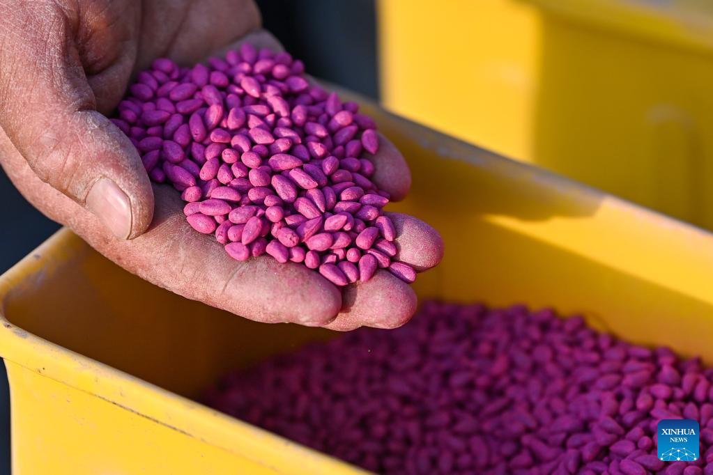 A farmer checks cotton seeds in Markit County, northwest China's Xinjiang Uygur Autonomous Region, April 2, 2023.