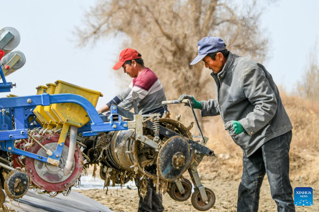 Cotton farmers prepare a seeding machine for spring sowing in Yuli County, northwest China's Xinjiang Uygur Autonomous Region, March 30, 2023.
