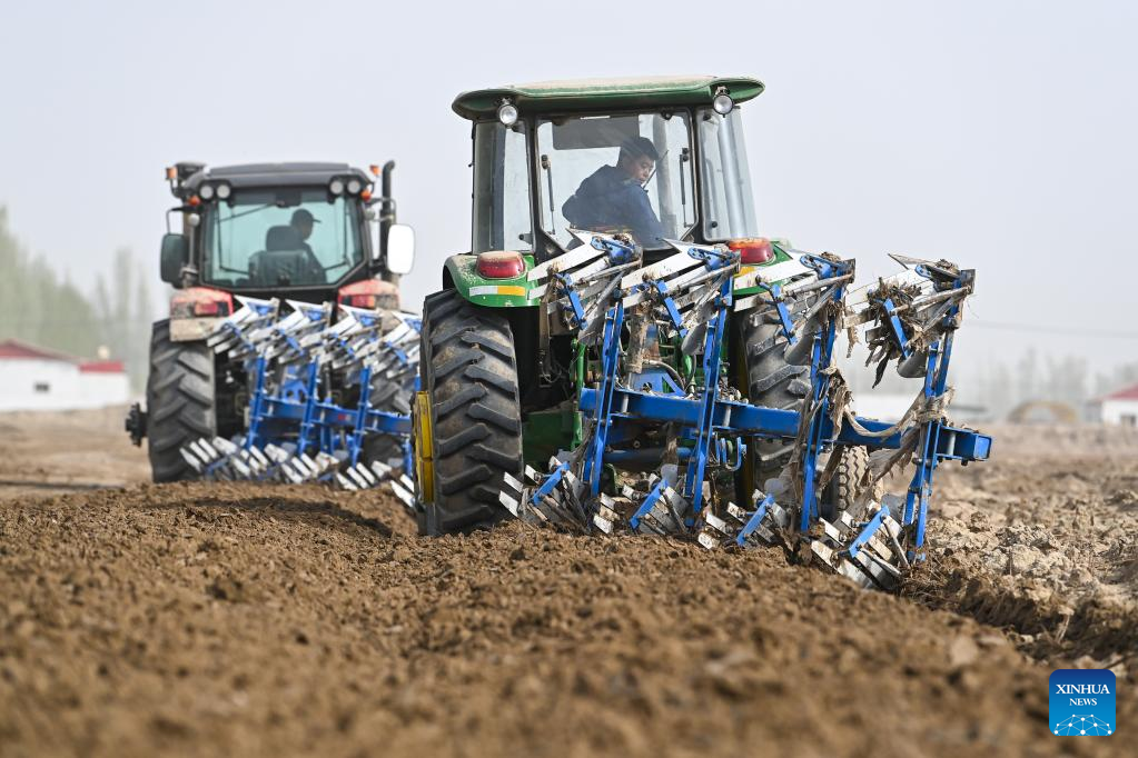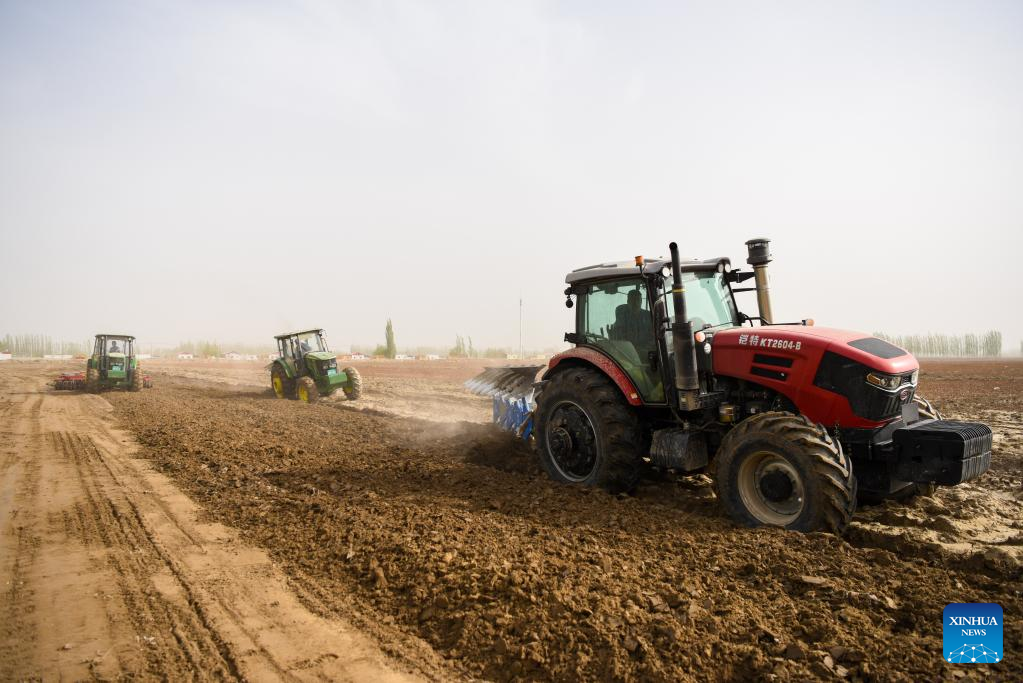 This photo taken on April 2, 2023 shows farming machines at work in a cotton field in Markit County, northwest China's Xinjiang Uygur Autonomous Region.