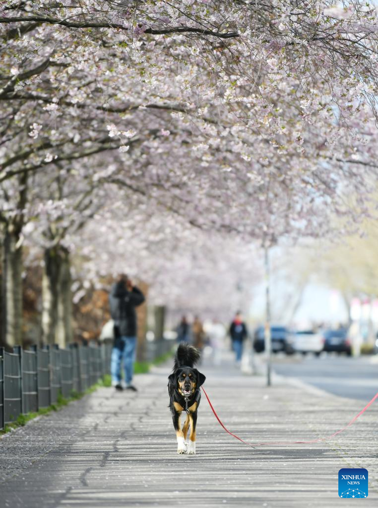A dog walks under cherry blossoms in Berlin, Germany, April 5, 2023. (Xinhua/Ren Pengfei)