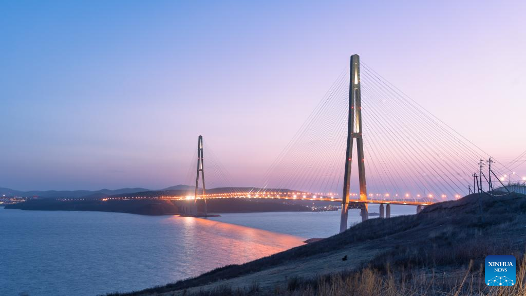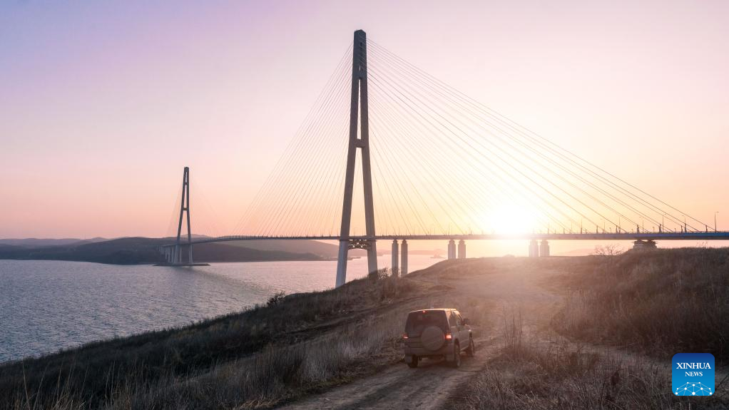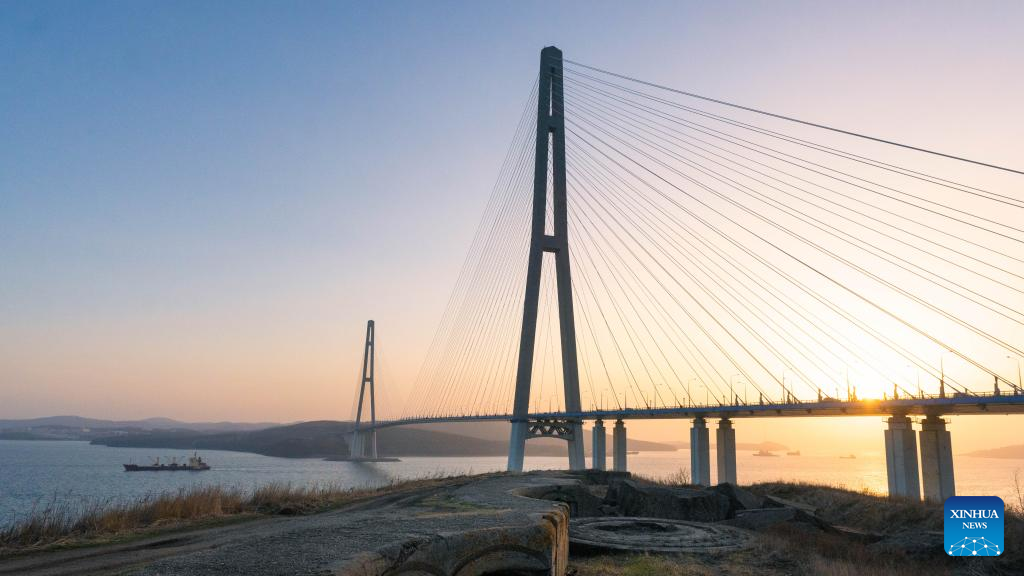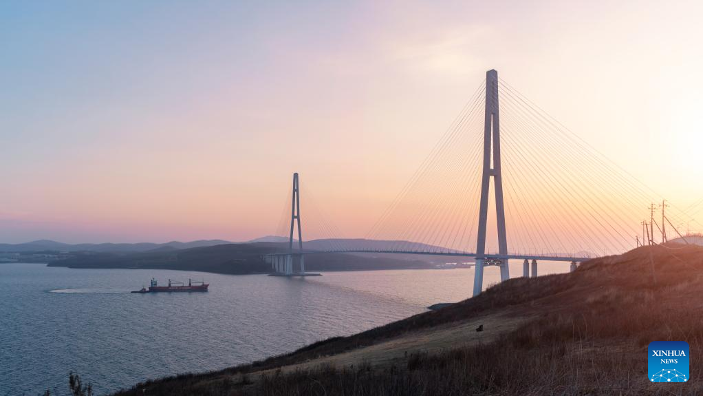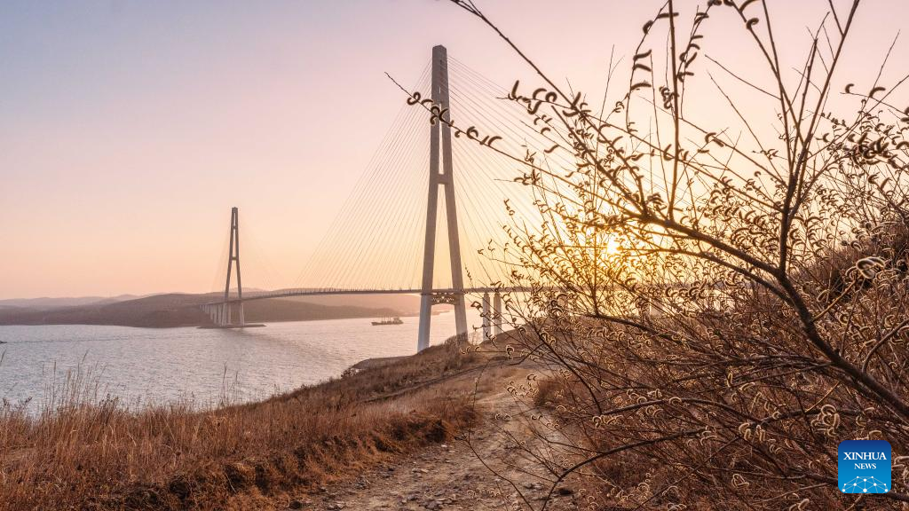 This photo taken on April 9, 2023 shows a grand bridge at sunset in Vladivostok, Russia. The bridge connects Russky Island with mainland Vladivostok. (Photo by Guo Feizhou/Xinnua)