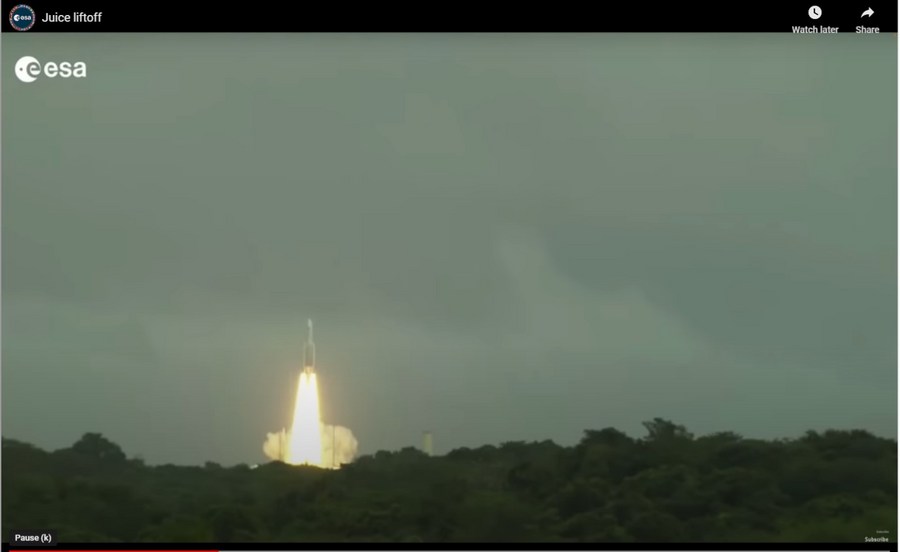 ESA's latest interplanetary mission, Juice, lifted off on an Ariane 5 rocket from Europe's Spaceport in French Guiana, at 14:14 CEST on April 14, 2023 to begin its eight-year journey to Jupiter. (a screenshot from ESA website)