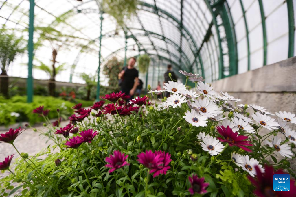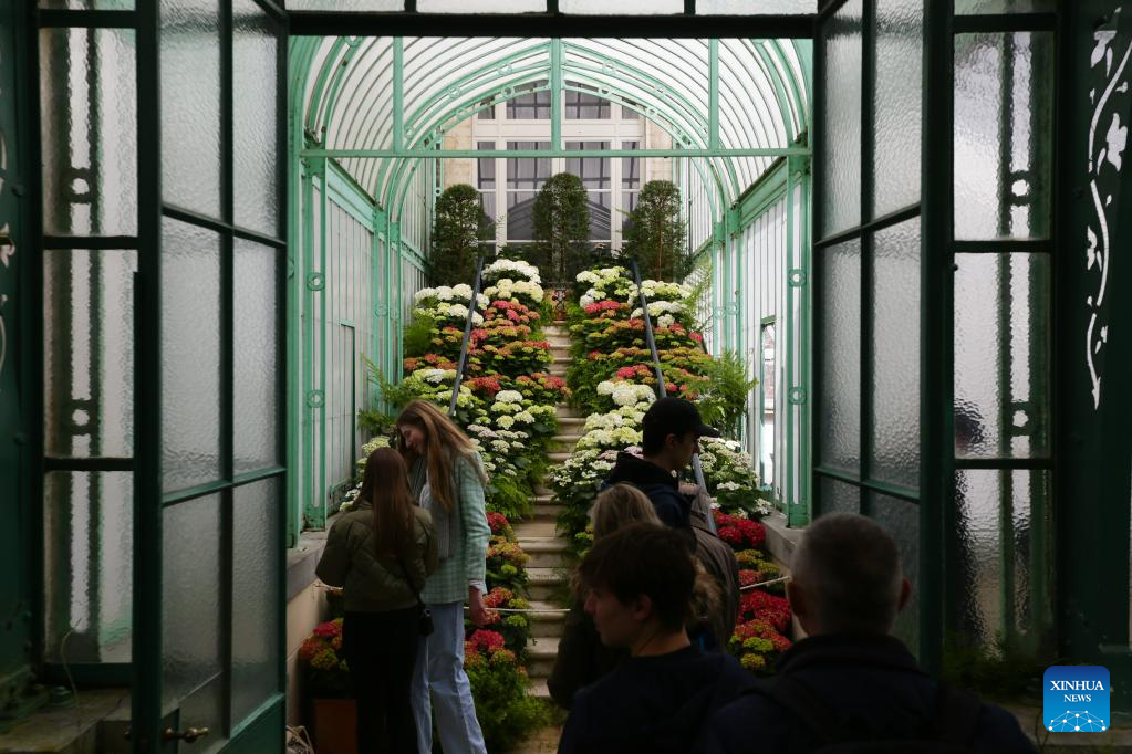 People visit the Royal Greenhouses of Laeken in Brussels, Belgium, on April 14, 2023. Belgium's Royal Greenhouses in Laeken of Brussels opens to the public from April 14 to May 7 this year. (Xinhua/Zheng Huansong)