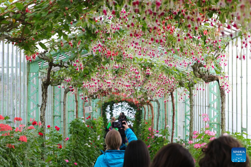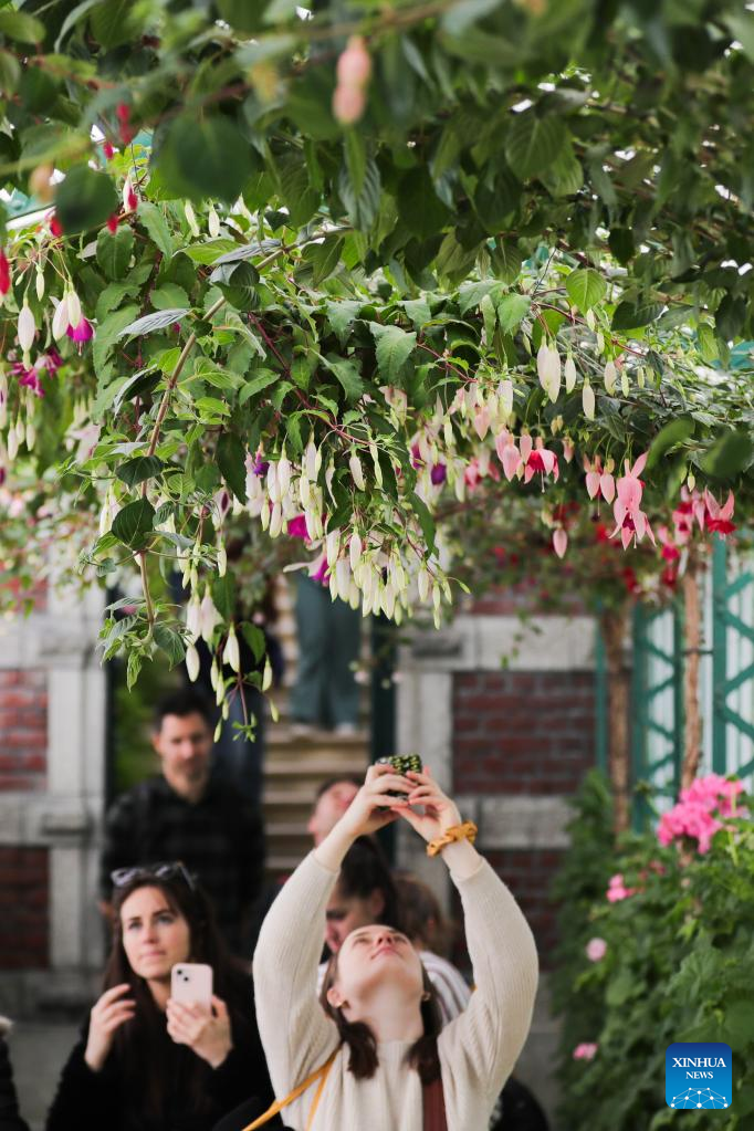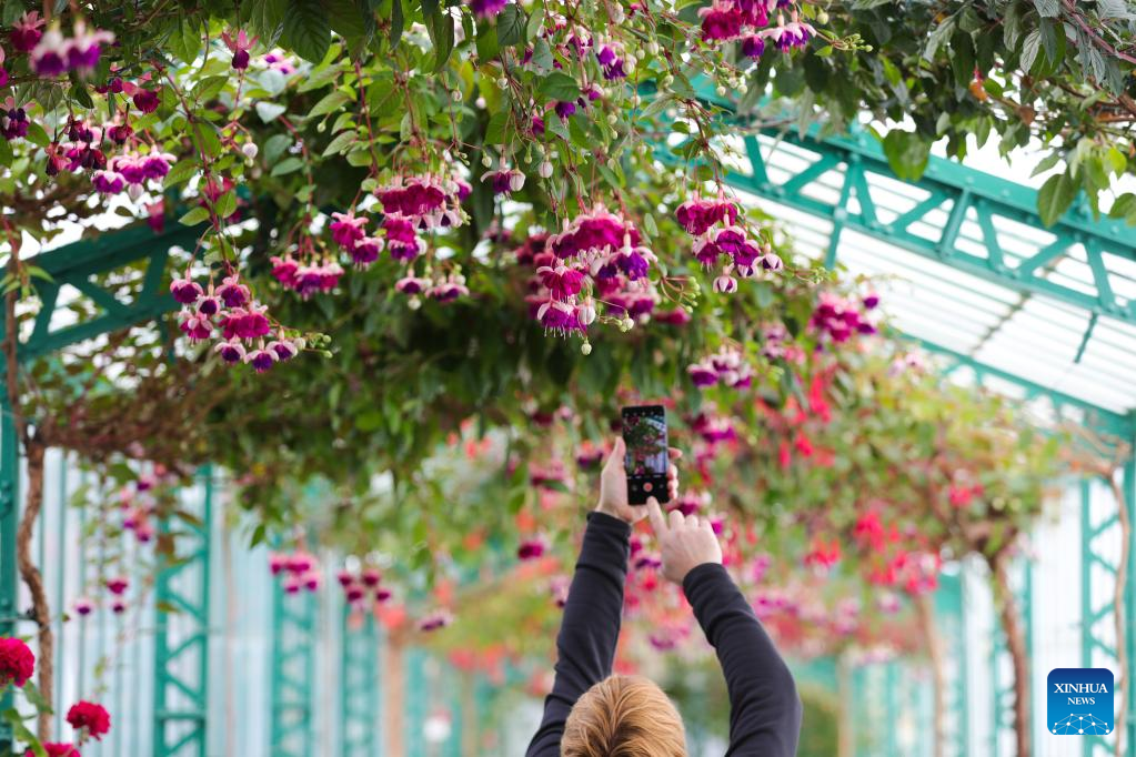 A visitor records flowers on video in the Royal Greenhouses of Laeken in Brussels, Belgium, on April 14, 2023. Belgium's Royal Greenhouses in Laeken of Brussels opens to the public from April 14 to May 7 this year. (Xinhua/Zheng Huansong)