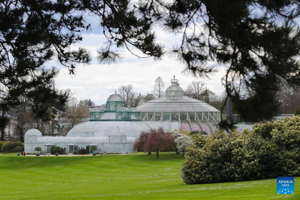 Photo taken on April 14, 2023 shows the Royal Greenhouses of Laeken in Brussels, Belgium. Belgium's Royal Greenhouses in Laeken of Brussels opens to the public from April 14 to May 7 this year. (Xinhua/Zheng Huansong)