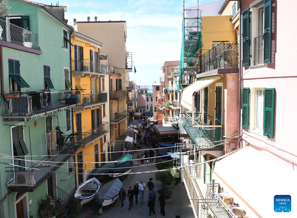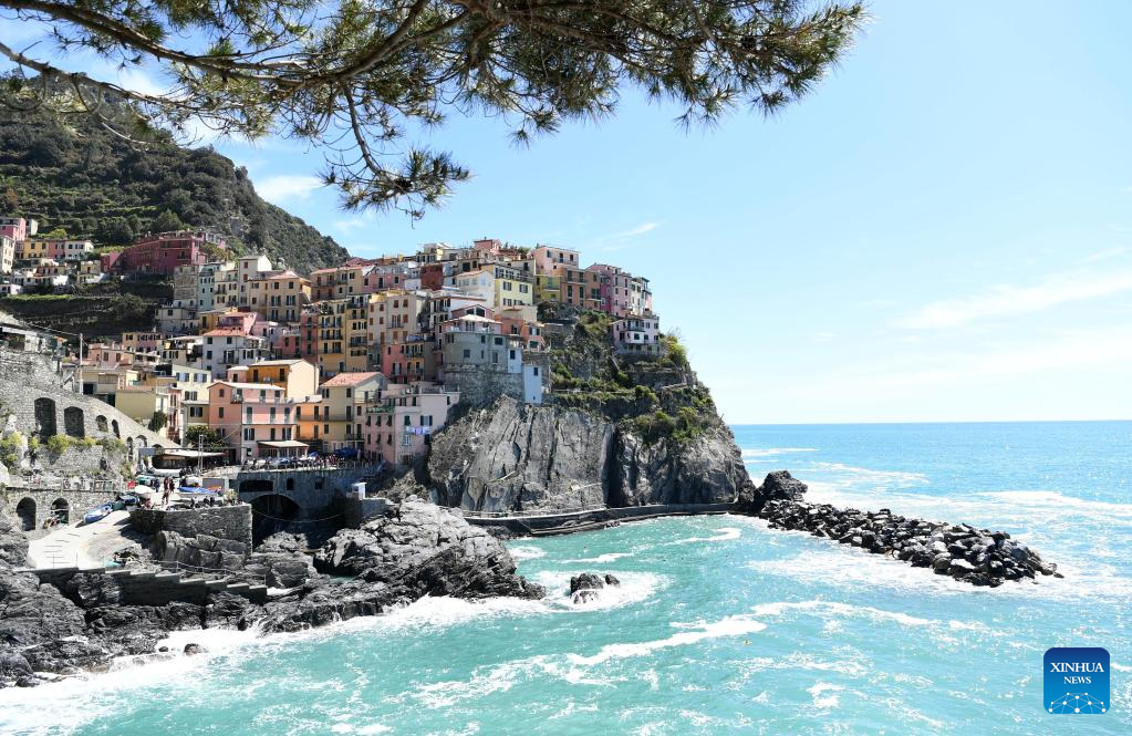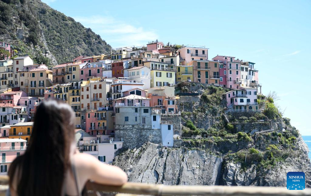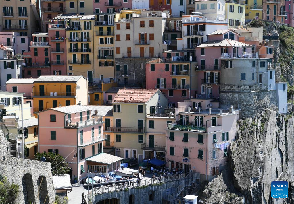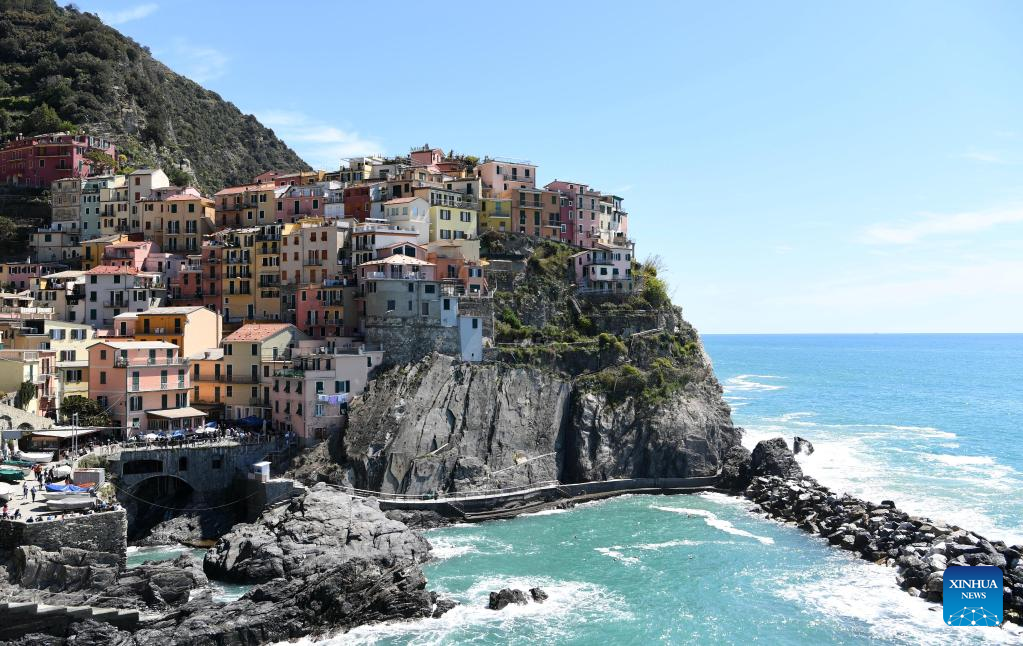 This photo taken on April 14, 2023 shows the view of Manarola in Cinque Terre National Park of Liguria, Italy. The celebrated Cinque Terre coastal area is a UNESCO World Heritage site. (Xinhua/Jin Mamengni)