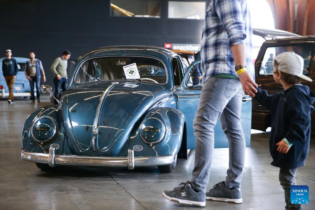 Visitors watch vehicles displayed at GR8 International Car Show in Kortrijk, Belgium, April 16, 2023. More than 1000 worldwide new and second hand cars including tuned cars, vintage cars and sports cars were displayed during the show. (Xinhua/Zheng Huansong)