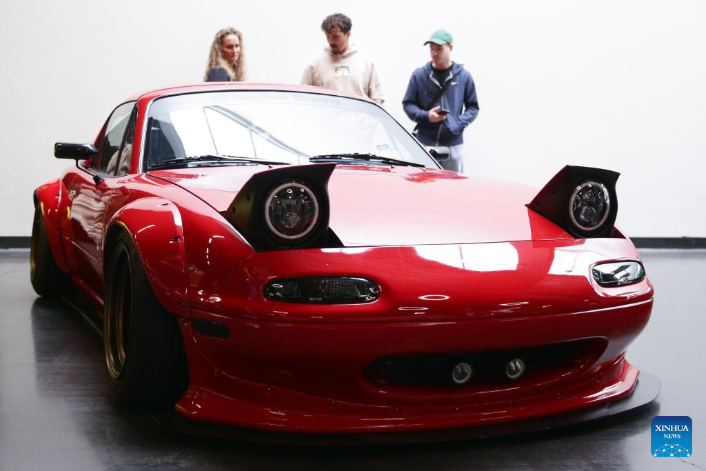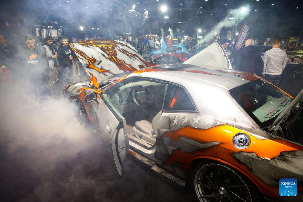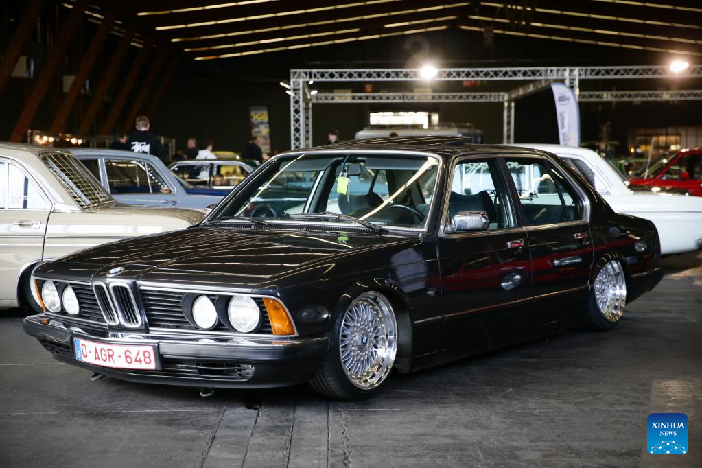 Vehicles are displayed at GR8 International Car Show in Kortrijk, Belgium, April 16, 2023. More than 1000 worldwide new and second hand cars including tuned cars, vintage cars and sports cars were displayed during the show. (Xinhua/Zheng Huansong)