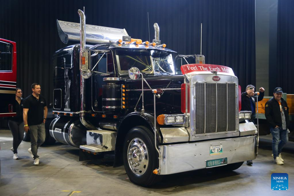 Visitors watch a truck displayed at GR8 International Car Show in Kortrijk, Belgium, April 16, 2023. More than 1000 worldwide new and second hand cars including tuned cars, vintage cars and sports cars were displayed during the show. (Xinhua/Zheng Huansong)