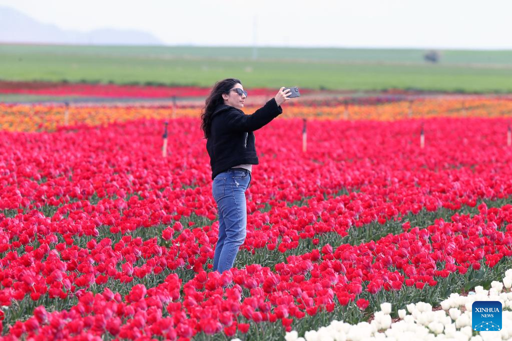 A woman takes a selfie in a field of blooming tulips in Konya, Türkiye, April 18, 2023. (Photo by Mustafa Kaya/Xinhua)