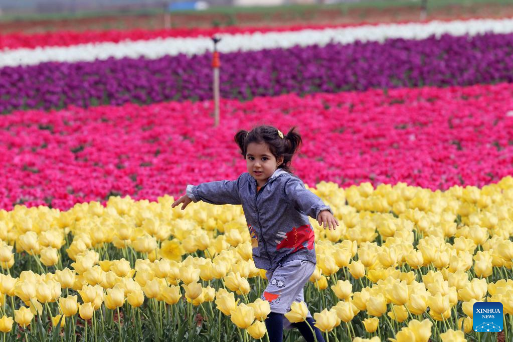 A kid runs in a field of blooming tulips in Konya, Türkiye, April 18, 2023. (Photo by Mustafa Kaya/Xinhua)
