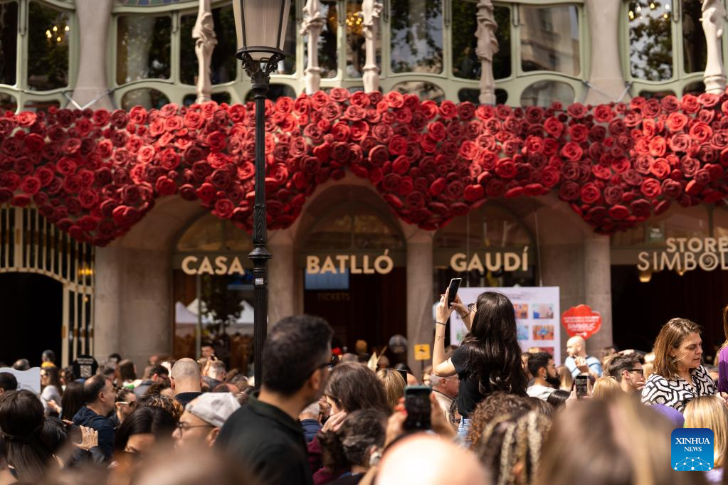 People visit the facade of Casa Batllo, a renowned building designed by architect Antoni Gaudi, in Barcelona, Spain, April 23, 2023. People give books and roses to celebrate the day of Sant Jordi, patron saint of Catalonia. (Photo by Joan Gosa/Xinhua)
