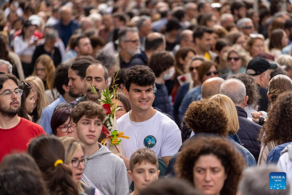 A man holding a rose bouquet walks on a street in Barcelona, Spain, April 23, 2023. People give books and roses to celebrate the day of Sant Jordi, patron saint of Catalonia. (Photo by Joan Gosa/Xinhua)